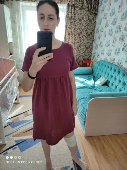 Очень долго не отправляли заказ, но я рада, что дождалась!!! Платье супер!!! Качество супер!!! Настоящий муслин!!! Пошито тоже идеально, я специально фото швов сделала. Благодарю сейчас ещё одно закажу! Мой рост 180, размер российский 46, заказала L, большеват, но для дома удобно.
