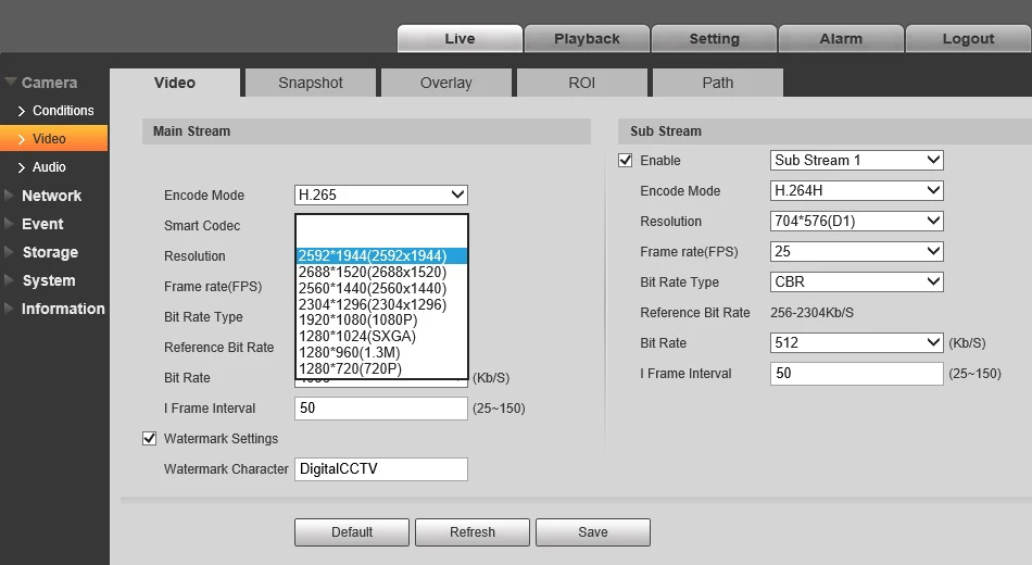 5. видеоСжатие: H.265 / H.264 / H.264H / H.264B / MJPEGРазрешение: 4M (2688X1520) / 4M (2560X1440) / 1080P (1920X1080) / 720P (1280X720) / D1 (704X576 / 704X480) / CIF (352X288 / 352X240)Частота кадров: 4M (1 ~ 20 кадров в секунду) / 3M (1 ~ 25 кадров в секунду) / D1 / CIF (1 ~ 25 кадров в секунду) / 720P (1 ~ 25 кадров в секунду)Битрейт: 24 кбит / с ~ 10240 кбит / сОбнаружение движения: выключено / включено (4 зоны, прямоугольник)Область интереса: Выкл. / Вкл. (4 зоны)Зеркало: выключено / включеноМаскировка конфиденциальности: Выкл. / Вкл. (4 области, прямоугольник)Переворот 0 °, 90 °, 180 °, 270 °
