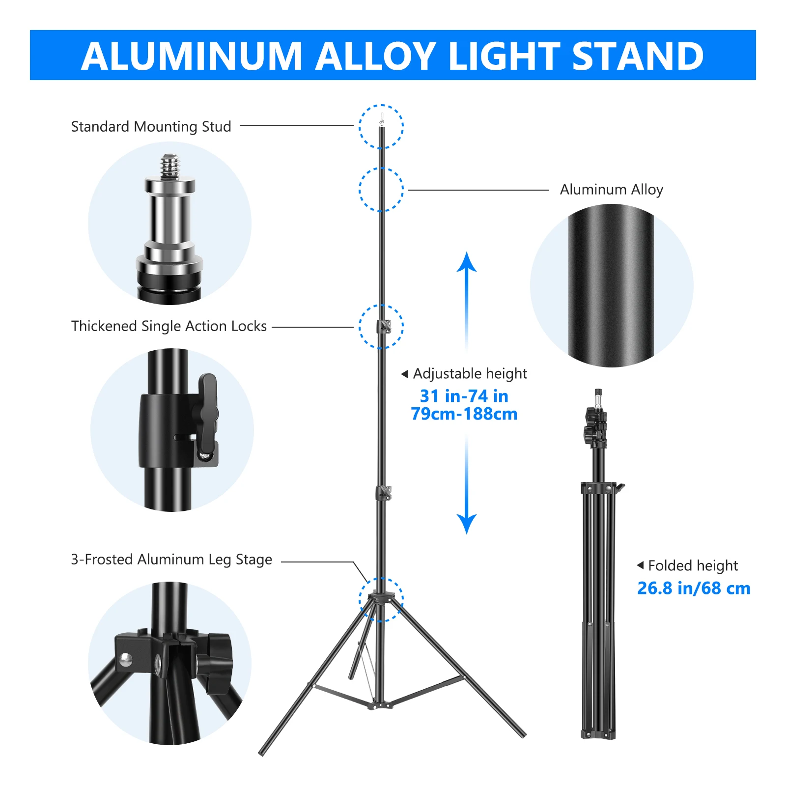 Регулируемая осветительная стойка: стойка для освещения из сплава алюминия Устойчив достаточно, чтобы поддерживать головного света и софтбокса. Легко установить и сложить. Отрегулируйте высоту от 31 "/79 см до 6 '/1,88 м