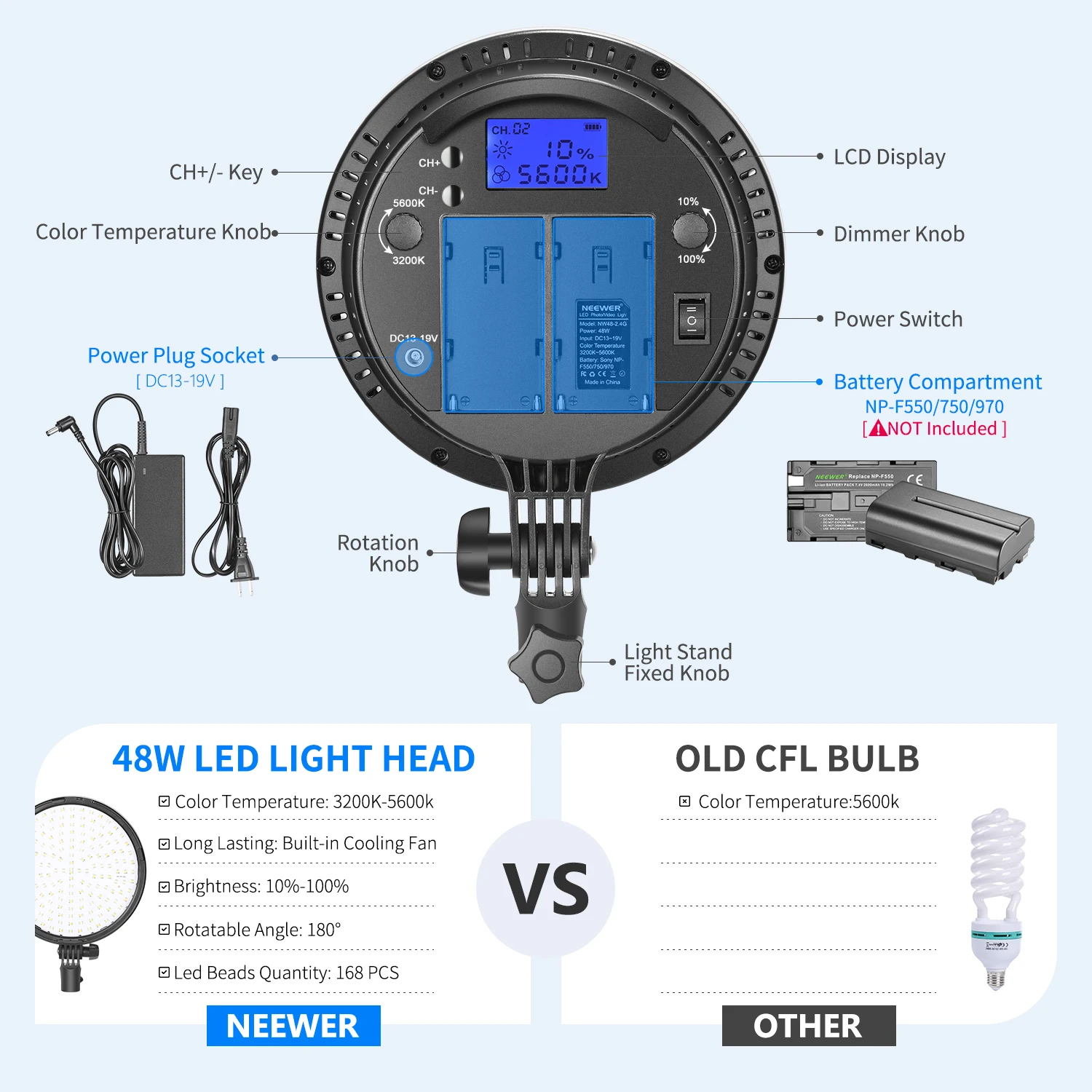 Контроль яркости света (от 10% до 100%) и регулировать цветовую температуру (от 3200K до 5600K) с бортовой контроль или 2,4 ГГц пульт дистанционного управления. Разблокировать свой творческий потенциал с красный/желтый/синий фильтр твердых частиц.