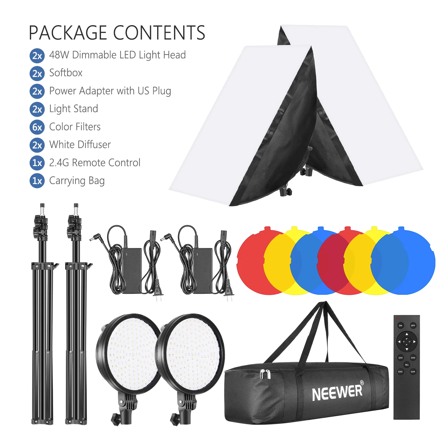 Комплектация: Neewer софтбокс с машинка для стрижки 48 Вт светодиодные лампы головного света от поставщика kes, 2 штуки в упаковке два легких стендов, два адаптера питания, две красные фильтры, две желтые фильтры, в виде двух синих фильтров, две белые рассеиватели, 2,4 ГГц пульт дистанционного управления,Сумка для переноски