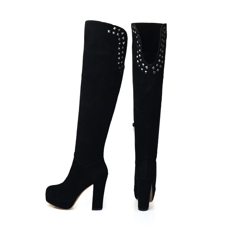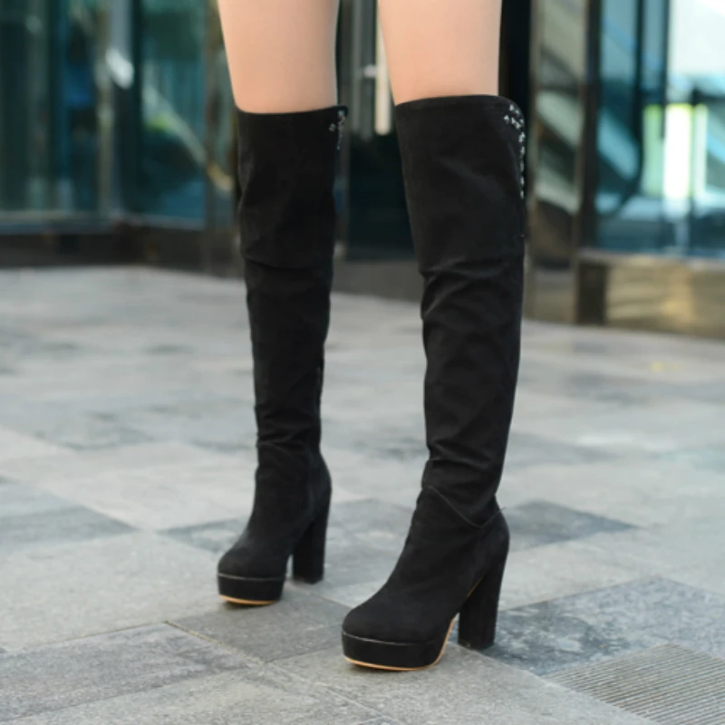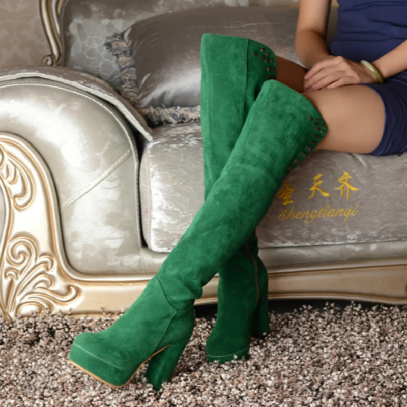 Модные сапоги до колена женские высокие сапоги из мягкого бархата зеленого и коричневого цвета зимние сапоги на платформе и высоком квадратном каблуке Большие размеры 48