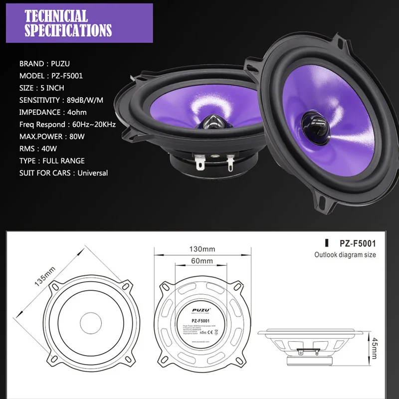 Автомобильный аудиодинамик, полный диапазон частот, модифицированный динамик средних басов, сабвуфер, 2 шт., 5 дюймов, 80 Вт