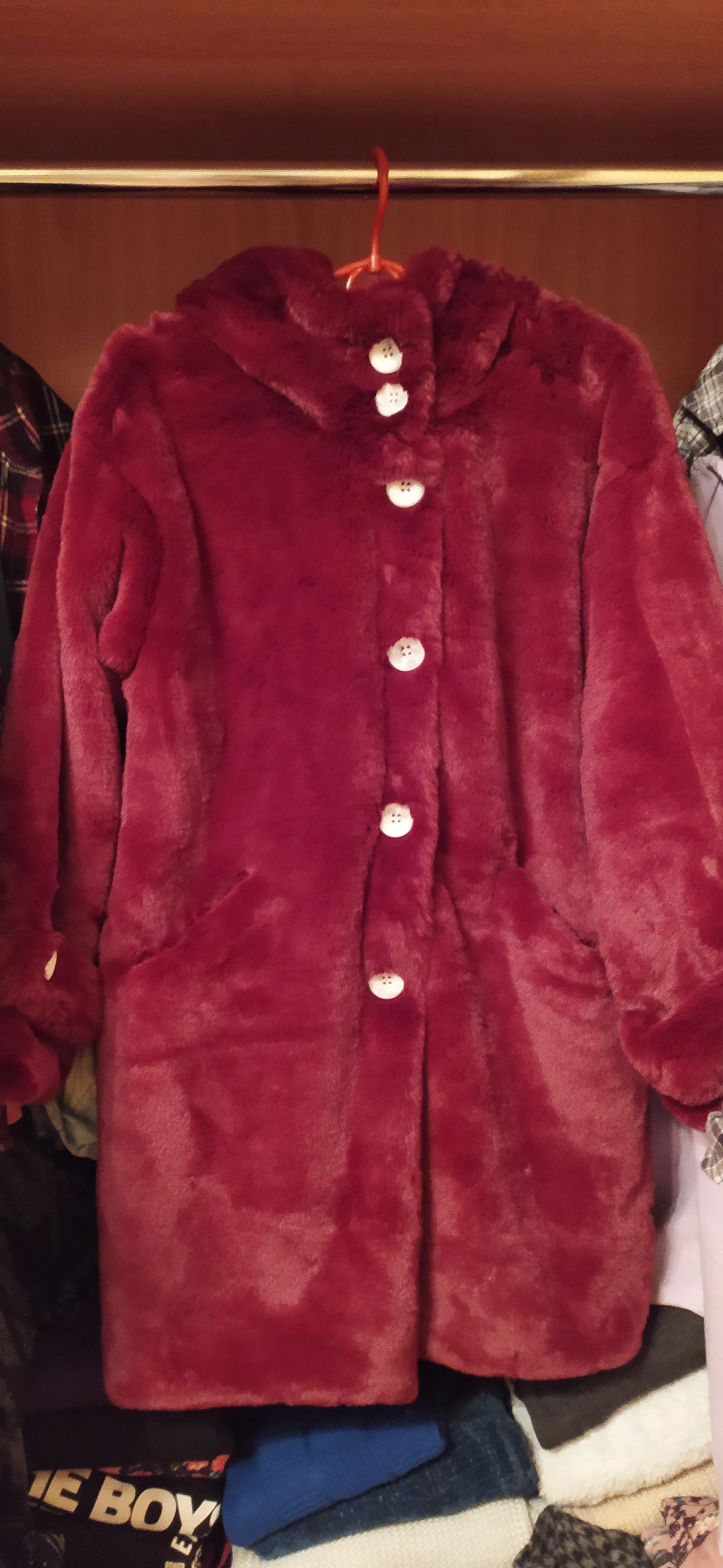 Отличная шубка! Мягкая, с утеплителем, фасон свободный, цвет красивый - бордо. Застежка под горло, не продует, капюшон глубокий. Дочери понравилась. М на 44 размер свободно. Не мятая, не пахнет. Спасибо продавцу!