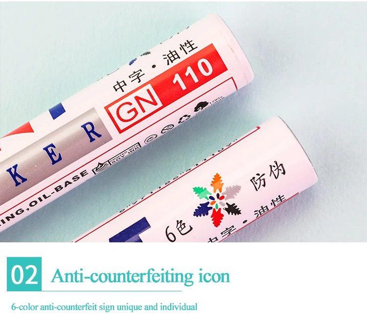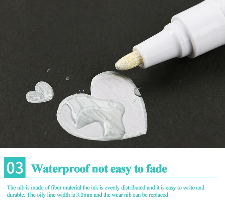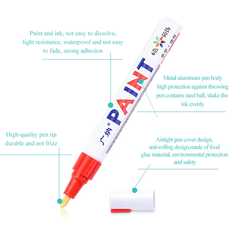 Краска и чернила, не легко растворяется, устойчивость к воздействию на светильник, водонепроницаемый и не легко выцветает, сильная адгезия | Металлический алюминиевый корпус ручки, высокая защита от бросания, ручка содержит стальной шарик, встряхните чернила равномерно Высококачественный наконечник ручки, прочный и не пухнет | Герметичный дизайн крышки ручки, дизайн анти-прокатки, изготовлен из пищевого Клеевого Материала, охрана окружающей среды и безопасность Специальные масляные чернила, яркие цвета | Цвет чернил красивый и привлекательный, Доступно 12 цветов; Не легко растворяется, высокая термостойкость 80 ℃ Наконечник высыхает до того, как чернила вытекли | После того, как чернила вытекли, цвет яркий | Высококачественный наконечник ручки, даже выход чернил Наконечник изготовлен из волоконного материала, чернила равномерно выводятся, и их легко писать и долговечно. Жирной ширина линии составляет 3,0 мм, а также носить перо может быть заменен Водонепроницаемый, не легко выцветает | Наконечник изготовлен из волокнистого материала, чернила равномерно распределены, и их легко писать и долговечно. Жирной ширина линии составляет 3,0 мм, а также носить перо может быть заменен