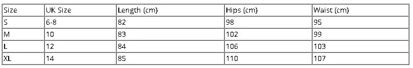 Размеры UK Размеры Длина (см) Обхват бедер (см) Обхват талии (см) S 6-8 82 98 95 М 10 83 102 99 L 12 84 106 103 XL 14 85 110 107