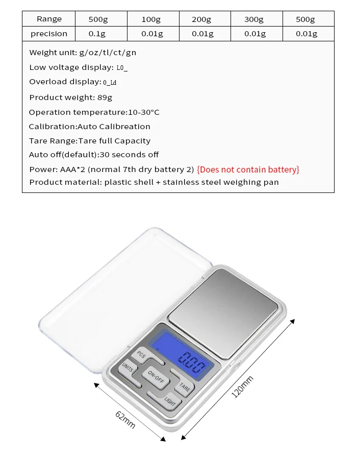 If The precision is 0.01g, but the minimum measuring weight is 0.05g and it is true of all the digital scales, pls kindly note it, tks!)