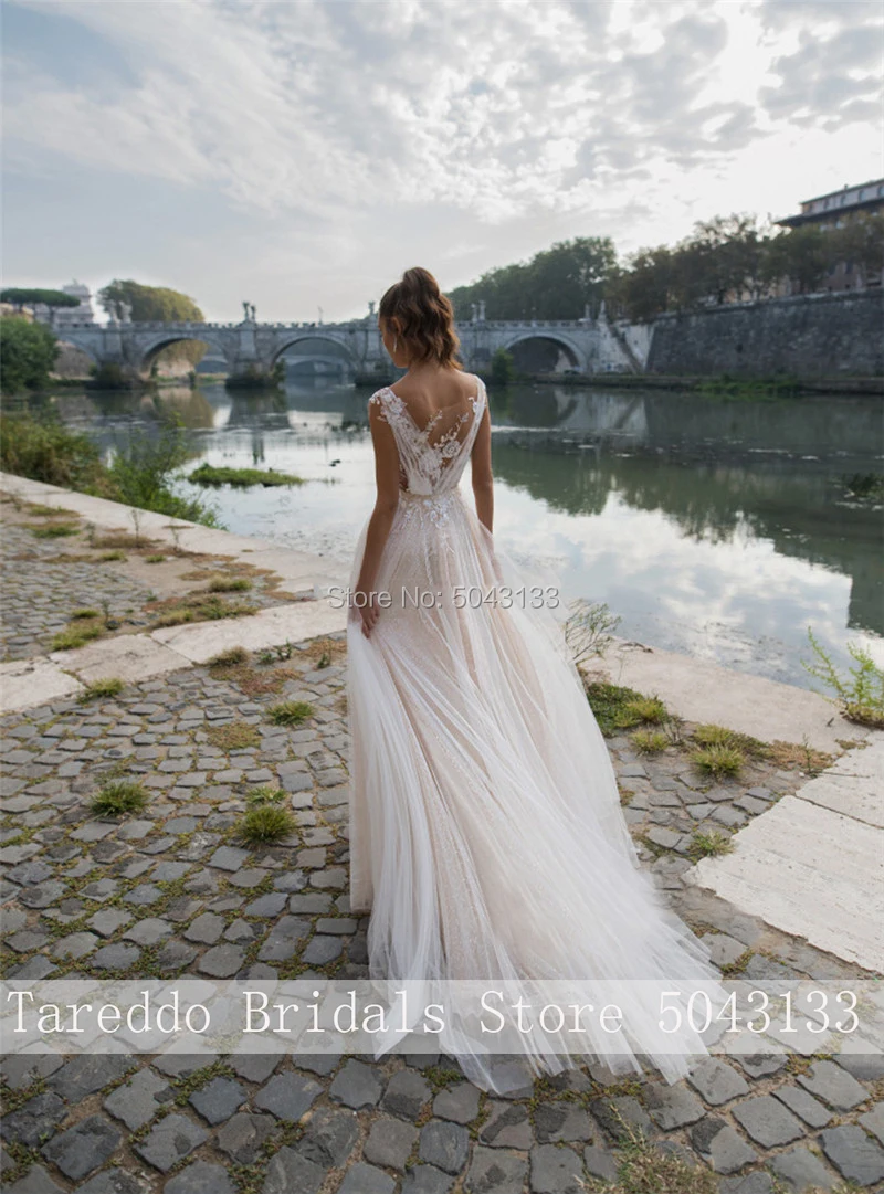 Шикарные Свадебные платья цвета шампанского, кружевные свадебные платья-трапеции с аппликацией и V-образным вырезом, Пляжное вечерние для невесты без рукавов, 2021