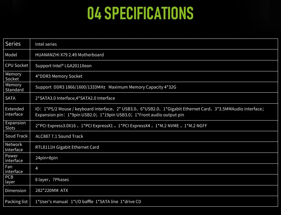 Модель: HUANANZHIТип товара: X79 зеленая материнская платаТип материнской платы: ATXСлот для видеокарты: 2 * PCI-E 3,0 16X 1 * PCI-E3.0 1X 1 * PCI-E3.0 4XВстроенная Видеокарта: нетИсточник питания: 7 источников питанияСлои печатной платы: 8Ethernet: гигабитТип процессора: LGA2011 (XEON E5 2620/2630/2640/2650/2660/2665/2670/2680/2690 C2 и V2)Слот памяти: 4 * DDR3(4 канала)Максимальный объем памяти: 32Gx4 DDR3Скорость памяти: 1866/1600/1333Поддерживаемый Тип памяти: без ecc/reg ecc/eccИнтерфейс SATA: SATA3.0x2 SATA2.0x4Интерфейс USB: USB3.0x4 USB2.0x10 (включая расширение)Интерфейс M.2: M.2 NVME + M.2 NGFFАудио порт: 7,1 каналРазмер: 282x220мм