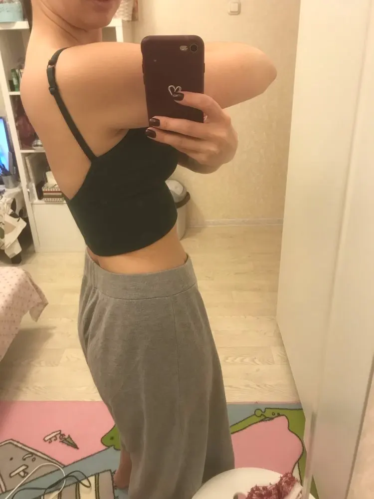 Отличный топ. Мне немного узковат в талии. Не давит. Просто сильно обтягивает мою не идеальную талию. Но качество отличное. Всё ровно. Шви ровные, нитки не торчат. Мне на небольшую грудь сел отлично. Есть сомнения насчёт лямок, будут ли сползать при тренировках. В целом рекомендую.