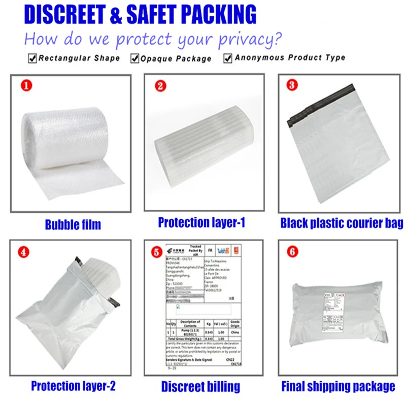 Продукт будет упакован в Непрозрачный почтовый пакет, если это искусственный дизайн, например, форма его выглядит как фаллоимитатор, он сначала будет упакован в бумажную коробку, затем положите в не прозрачный, никто не сможет узнать, что внутри на ощупь. В сообщении почтового отделения также нет слов «секс-игрушка», все продукты будут декларированы как товары на каждый день, например, «пластиковый массажер», пластиковая Палочка ”,“ силиконовая трубка ”и так далее, 100% частная доставка.
