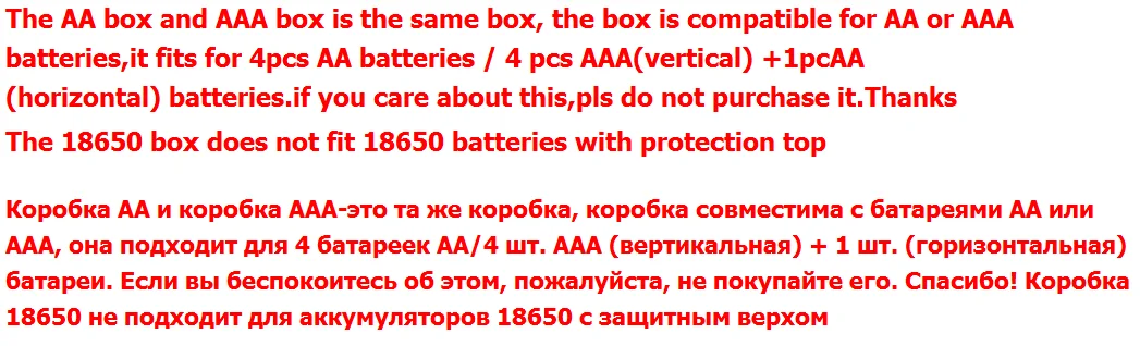 Коробка AA и коробка AAA-это та же коробка, коробка совместима с батареями AA или AAA, она подходит для 4 батареек AA/4 шт. AAA (вертикальная) + 1 шт. (горизонтальная) батареи. Если вы беспокоитесь об этом, пожалуйста, не покупайте его. Спасибо! Коробка 18650 не подходит для аккумуляторов 18650 с защитным верхом