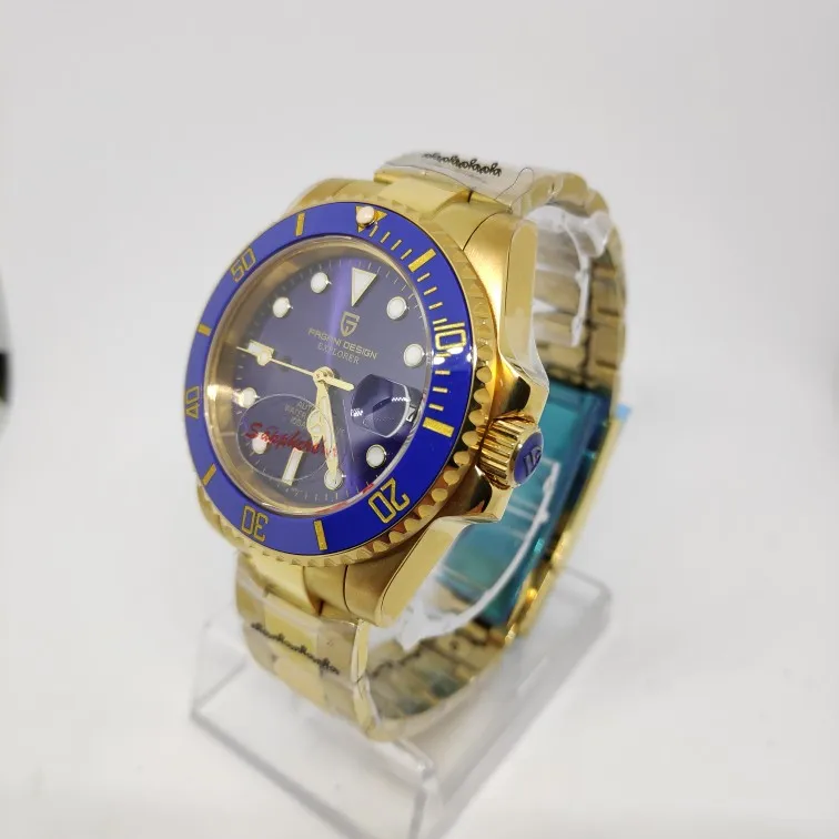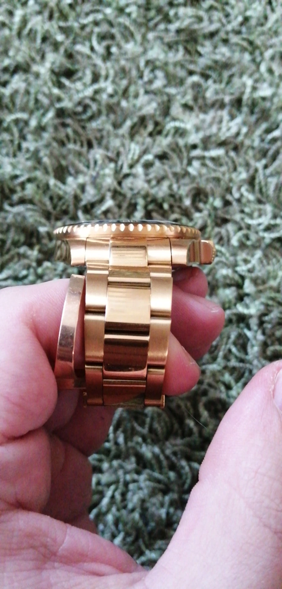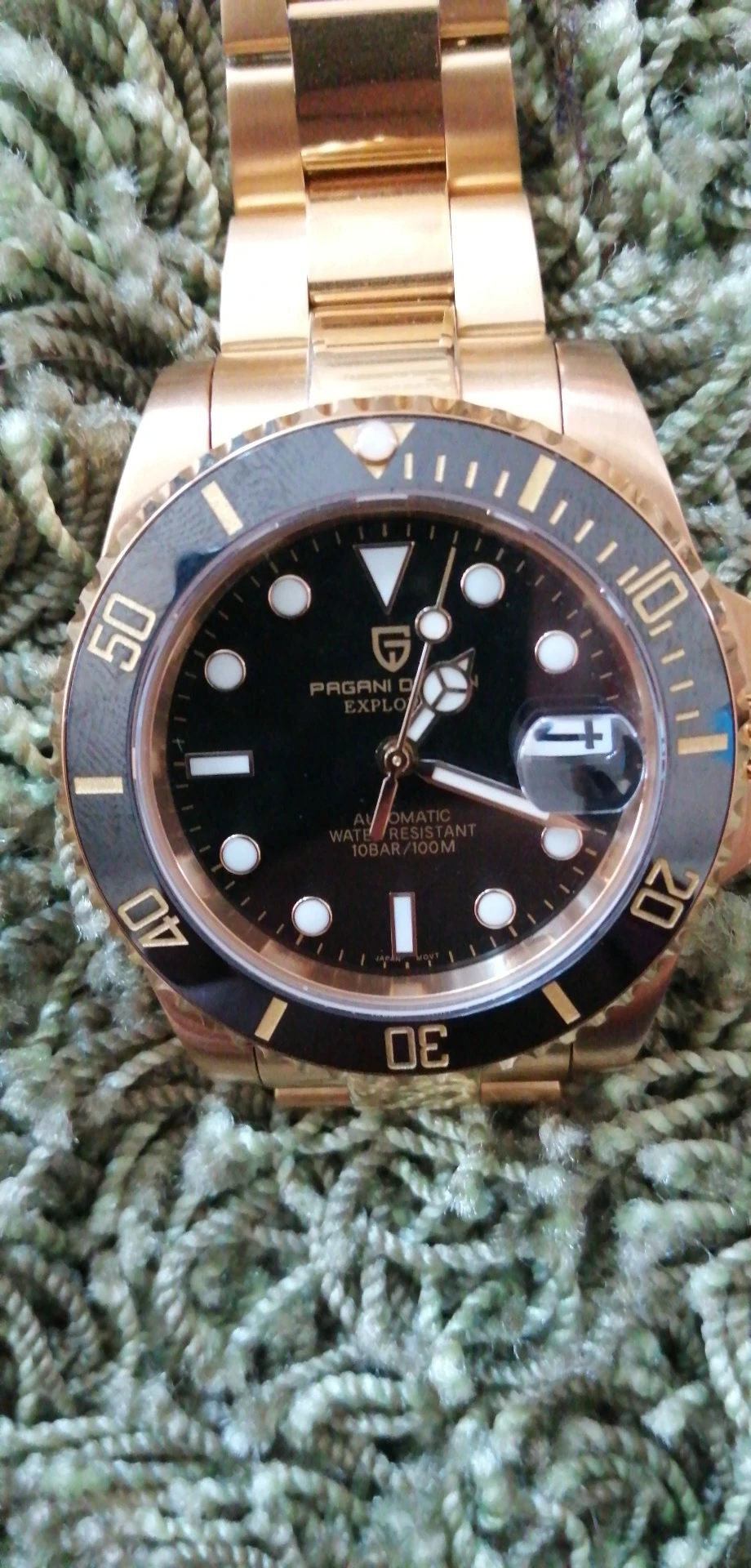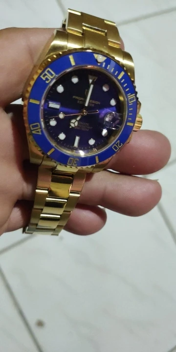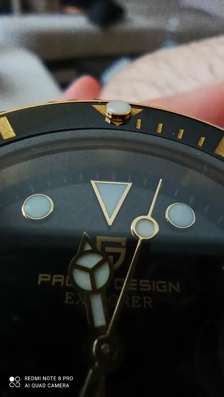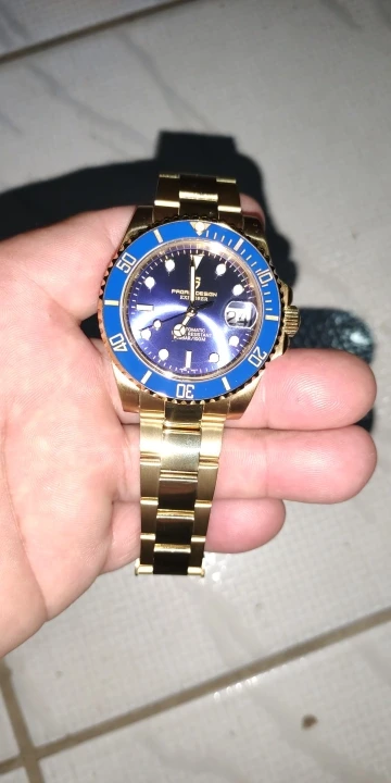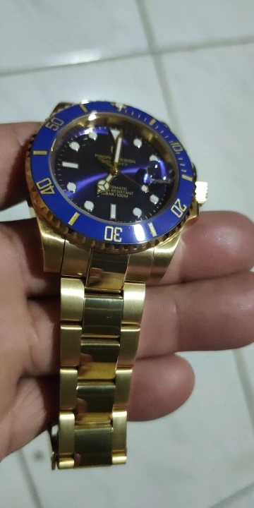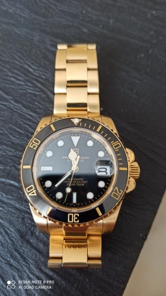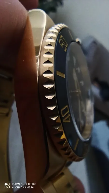 В целом очень хорошее качество за деньги, золотой цвет близок к реальному золоту, подвижный механизм, сапфировое стекло, фрезерованная застежка, керамический ободок, твердые звенья/концевые звенья и отвертки приветствуются добавками по цене. Есть некоторые негативы, ободок немного свободный, выравнивание ободка, циклоп и некоторые из часовых маркеров немного выключены, а расширение погружений очень жесткое, по крайней мере, на часах, которые я был отправлен. Однако я доволен часами, вы не можете ожидать мир по этой цене.