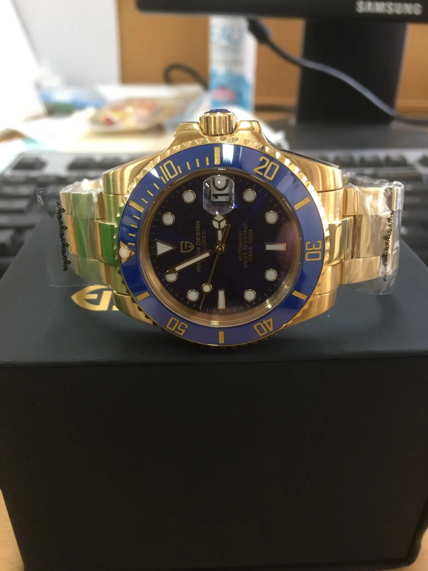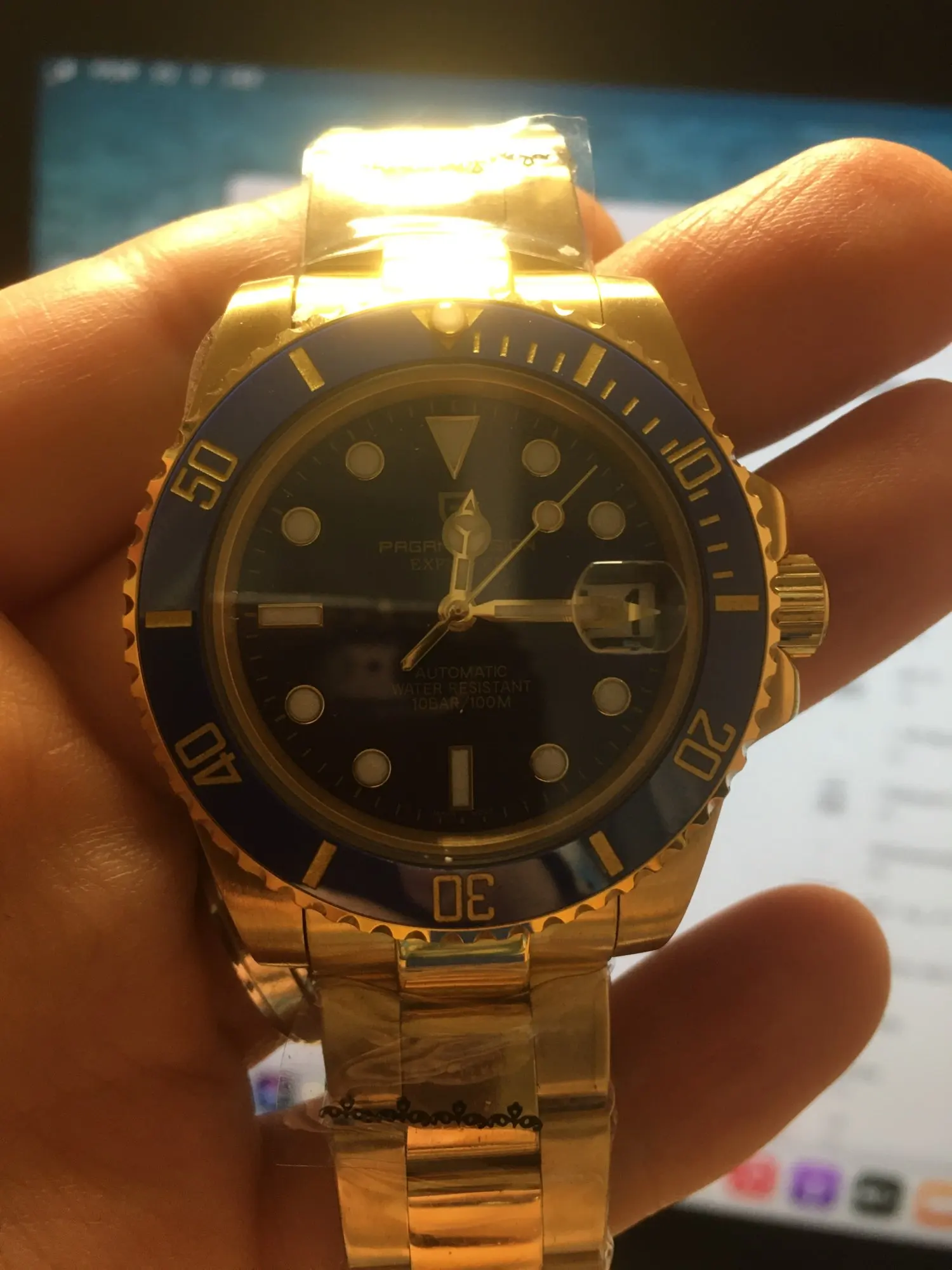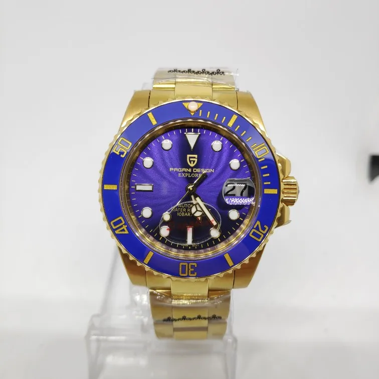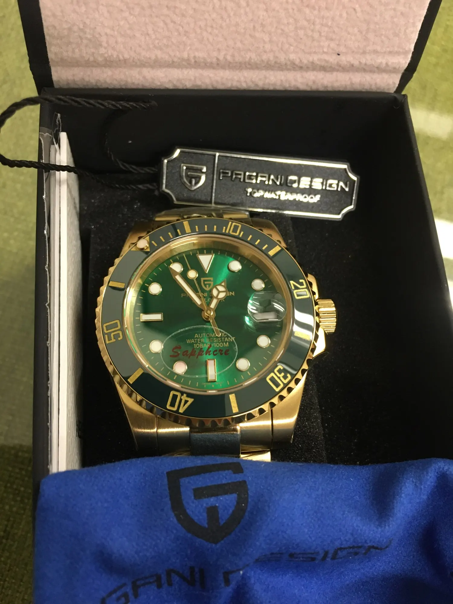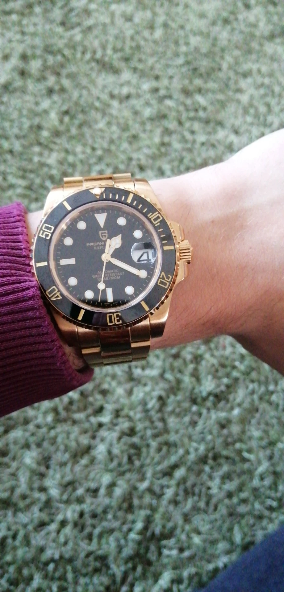 В целом очень хорошее качество за деньги, золотой цвет близок к реальному золоту, подвижный механизм, сапфировое стекло, фрезерованная застежка, керамический ободок, твердые звенья/концевые звенья и отвертки приветствуются добавками по цене. Есть некоторые негативы, ободок немного свободный, выравнивание ободка, циклоп и некоторые из часовых маркеров немного выключены, а расширение погружений очень жесткое, по крайней мере, на часах, которые я был отправлен. Однако я доволен часами, вы не можете ожидать мир по этой цене.