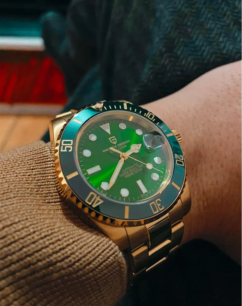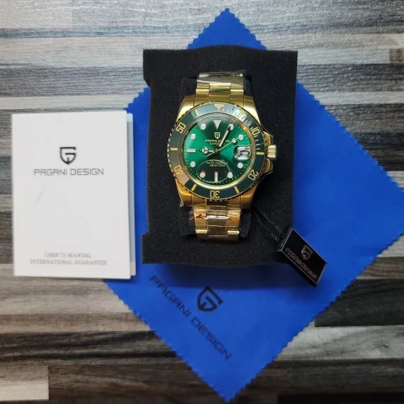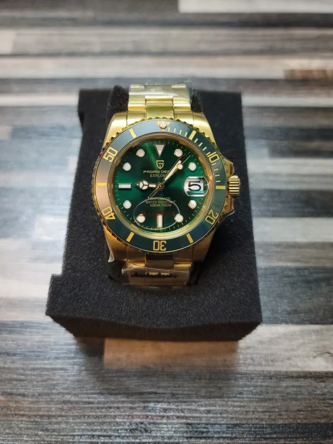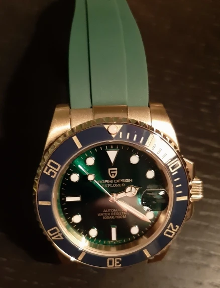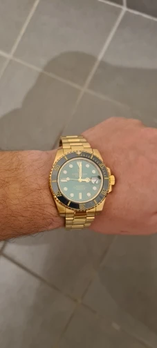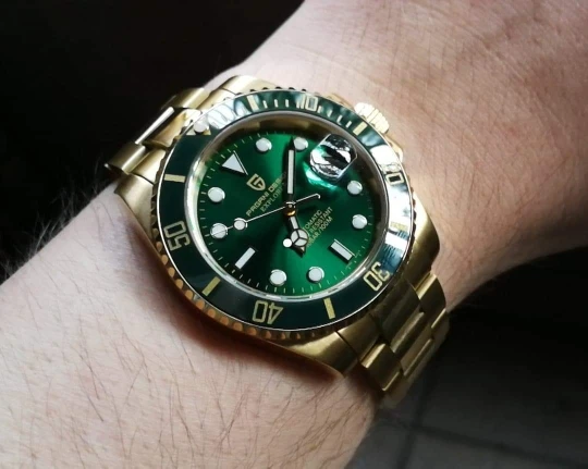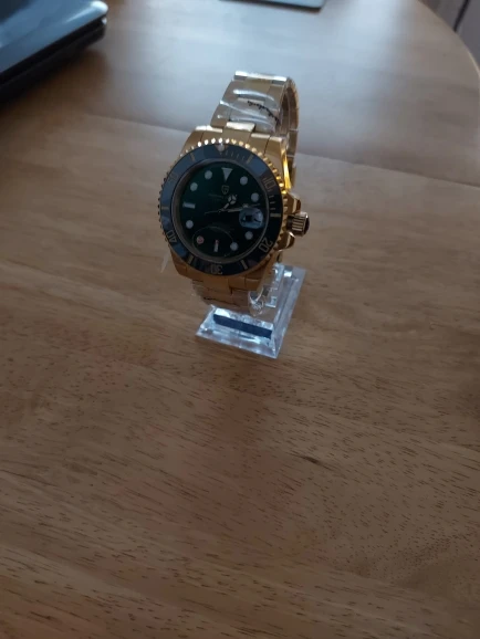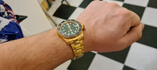 Часы прибыли в течение 4 дней (Европа). Часы с зеленым циферблатом выглядят фантастически по цене. Ободок темно-зеленого цвета, цвет не меняется с учетом освещения. Не ожидайте, что ободок получит Изумрудный цвет снаружи, так как это делает настоящий корпус. Золотой тон корпуса и браслета не сверкающий желтый, а более медный золотой. Я очень рад этому. Зеленый/золотой цвет выглядит потрясающе. Это очень классные часы.