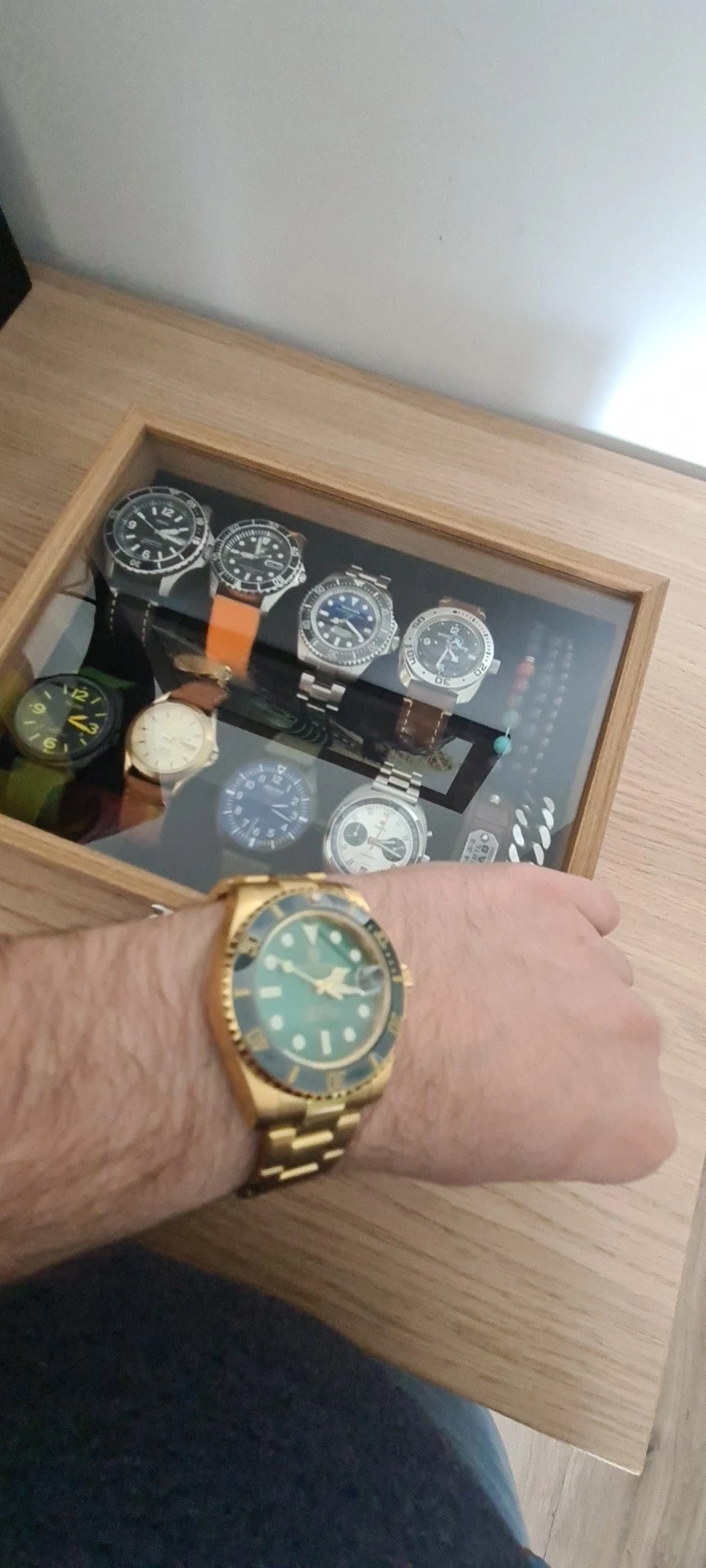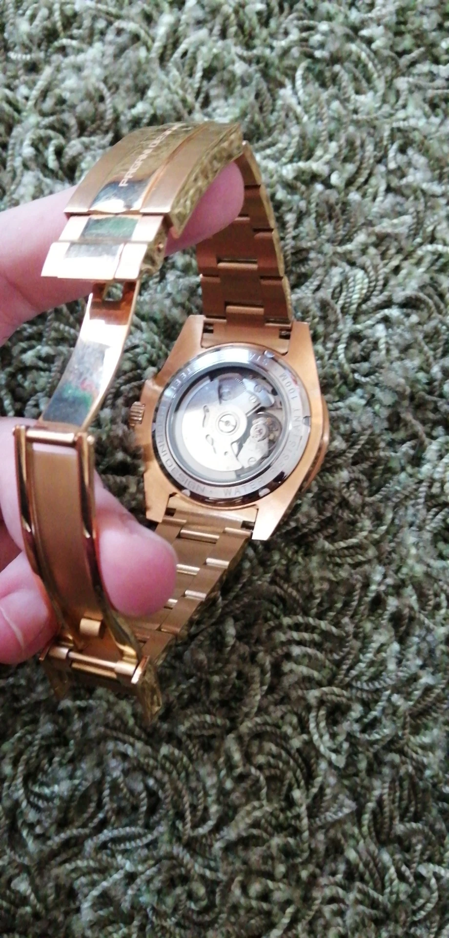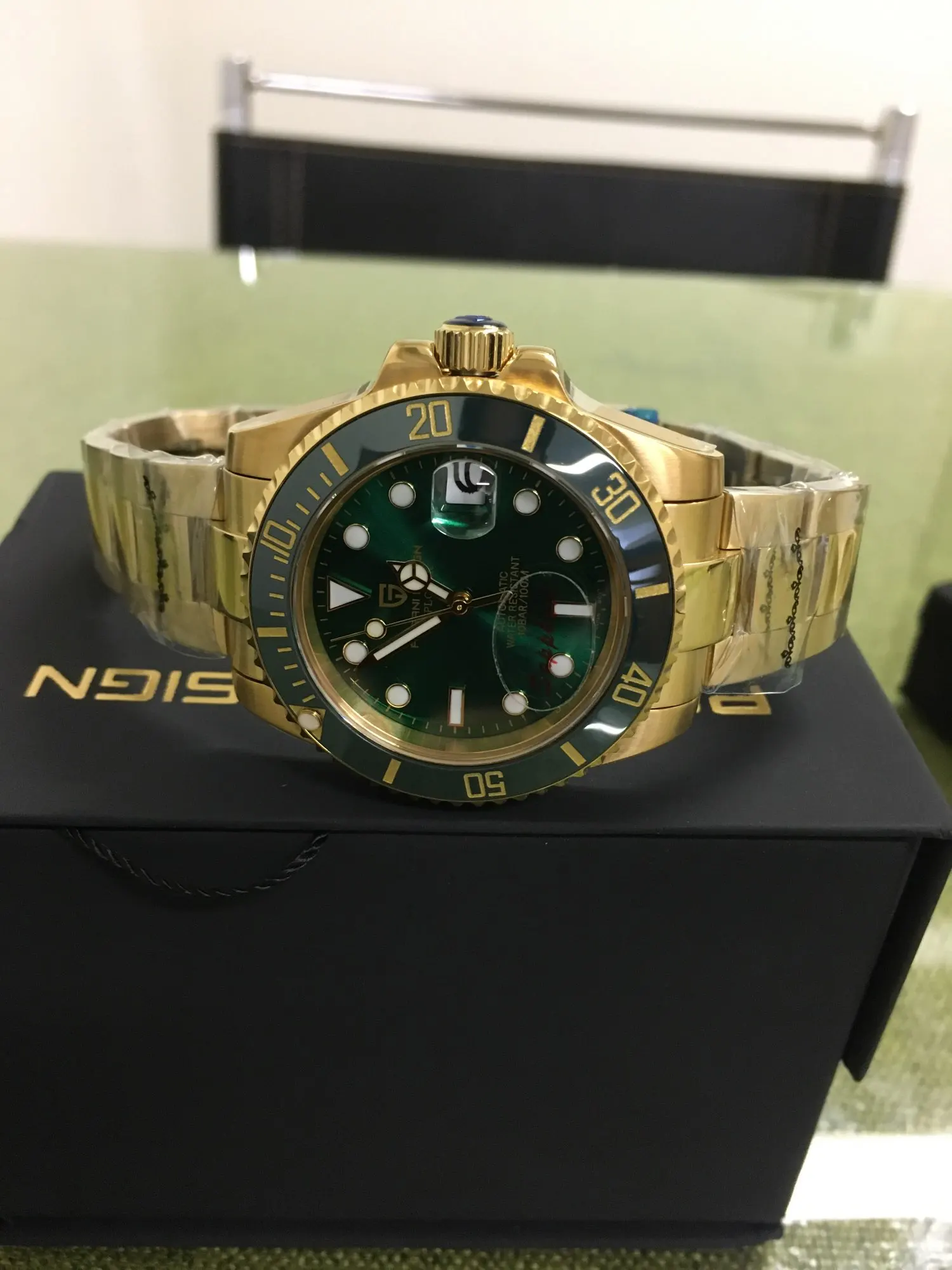 Часы прибыли в течение 4 дней (Европа). Часы с зеленым циферблатом выглядят фантастически по цене. Ободок темно-зеленого цвета, цвет не меняется с учетом освещения. Не ожидайте, что ободок получит Изумрудный цвет снаружи, так как это делает настоящий корпус. Золотой тон корпуса и браслета не сверкающий желтый, а более медный золотой. Я очень рад этому. Зеленый/золотой цвет выглядит потрясающе. Это очень классные часы.