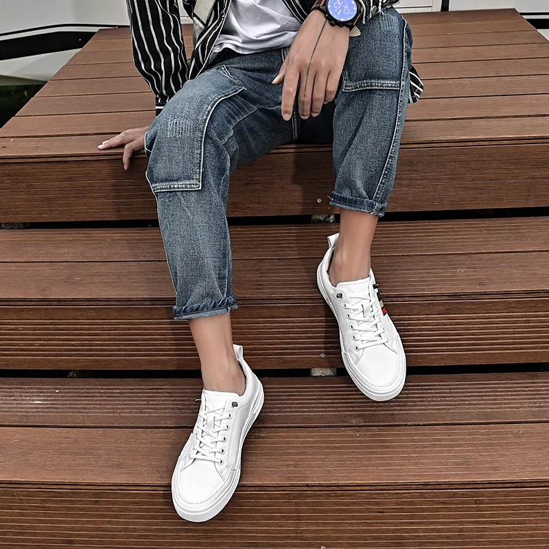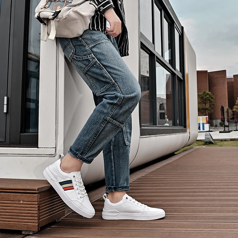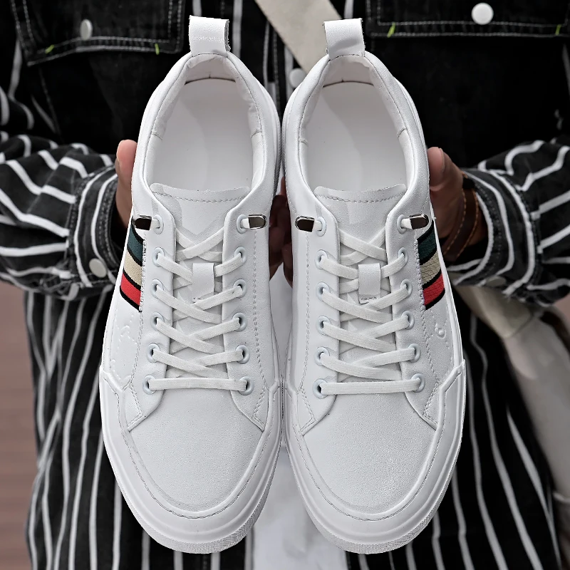 Кроссовки мужские из натуральной кожи, модная роскошная дизайнерская обувь в белую полоску, на вулканизированной подошве, на шнуровке, повседневные кеды
