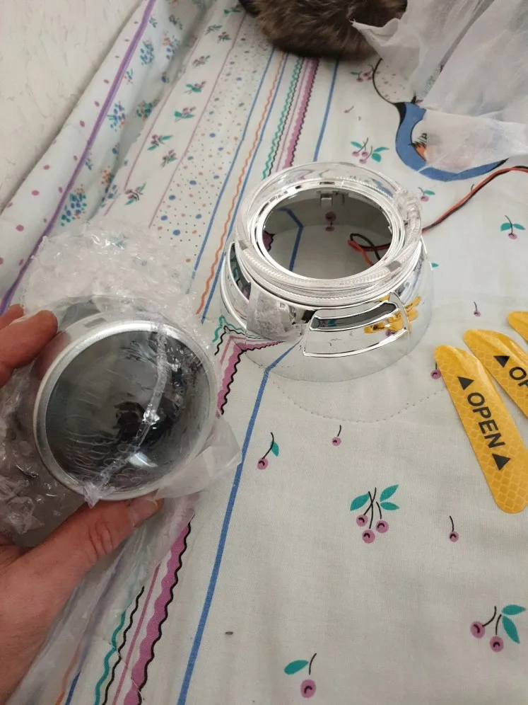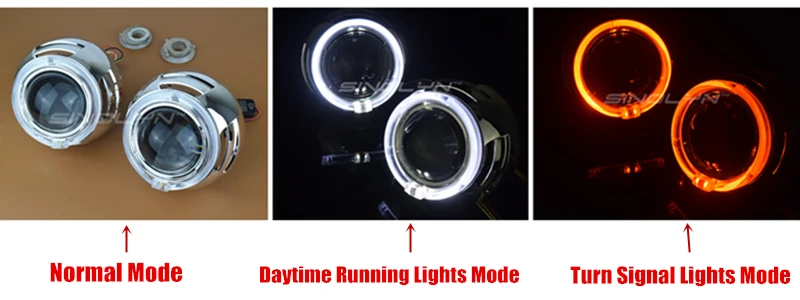 Кроме того, объектив проектора с супер ярким светодиодный волоконно-оптическим ангельским глазом с функцией указателя поворота. При нормальном вождении глаза ангела белого цвета. Когда вы подаете сигнал поворота, глаза ангела изменятся на желтый цвет.