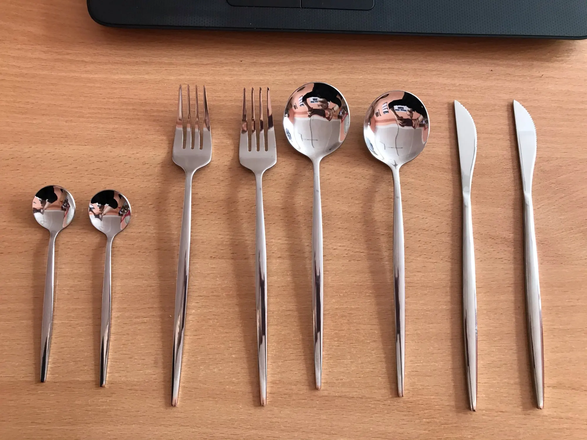 Столовое серебро выглядит отлично и кажется достаточно прочным для ежедневного использования. Даже увидев Сравнение размеров на фотографиях, я не вполне ожидал, что чайная ложка по сравнению с другими предметами, но она милая.