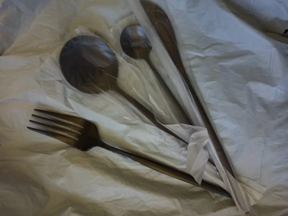заказ пришел очень быстро. за 10 дней до Рязани. Выглядит красиво, правда не нож а скальпель какой, но тупой. Он видимо и не должен быть острым - там зубцы. Жаль что вилка (в общем то основное что нужно было из набора) с какой то полосой сзади и мелкой царапкой. В еде пока не использовала, не мыла.