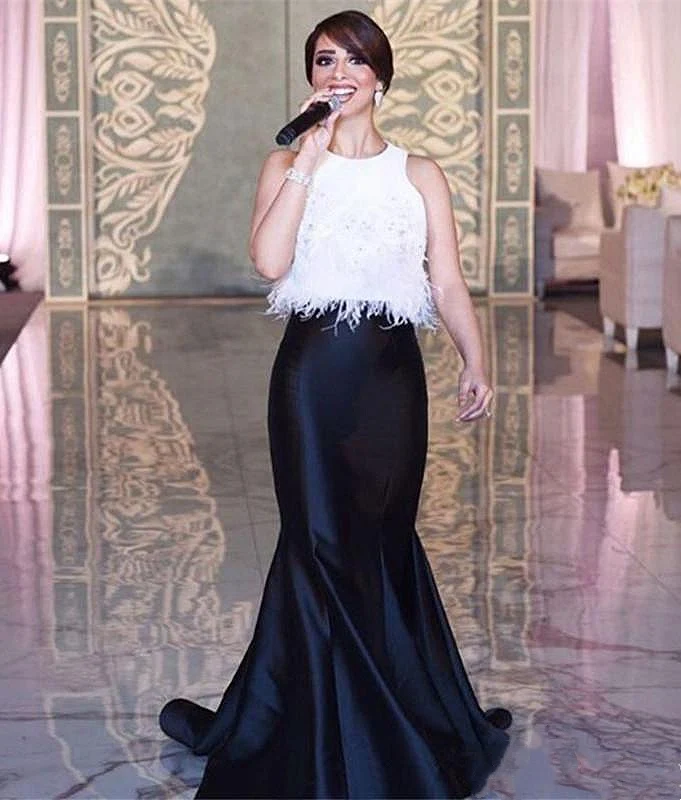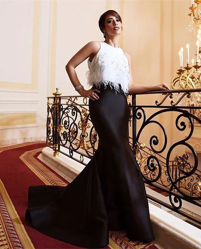 Женское вечернее платье без рукавов, Белое и черное платье из двух предметов, украшенное перьями, для торжественных вечеринок, выпускного вечера