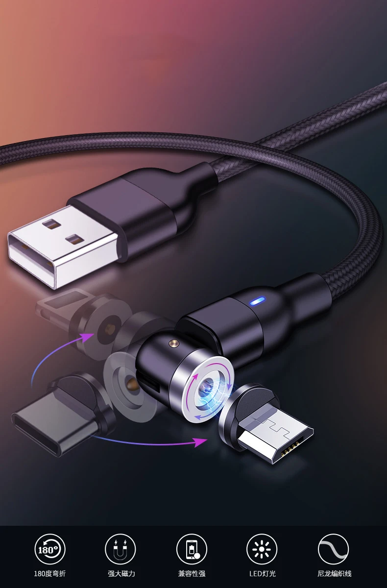 Магнитный кабель, вращающийся на 2020 градусов, кабель Micro USB Type-C, Магнитный зарядный кабель для iPhone 11 Pro Max, линия передачи данных, новинка 540