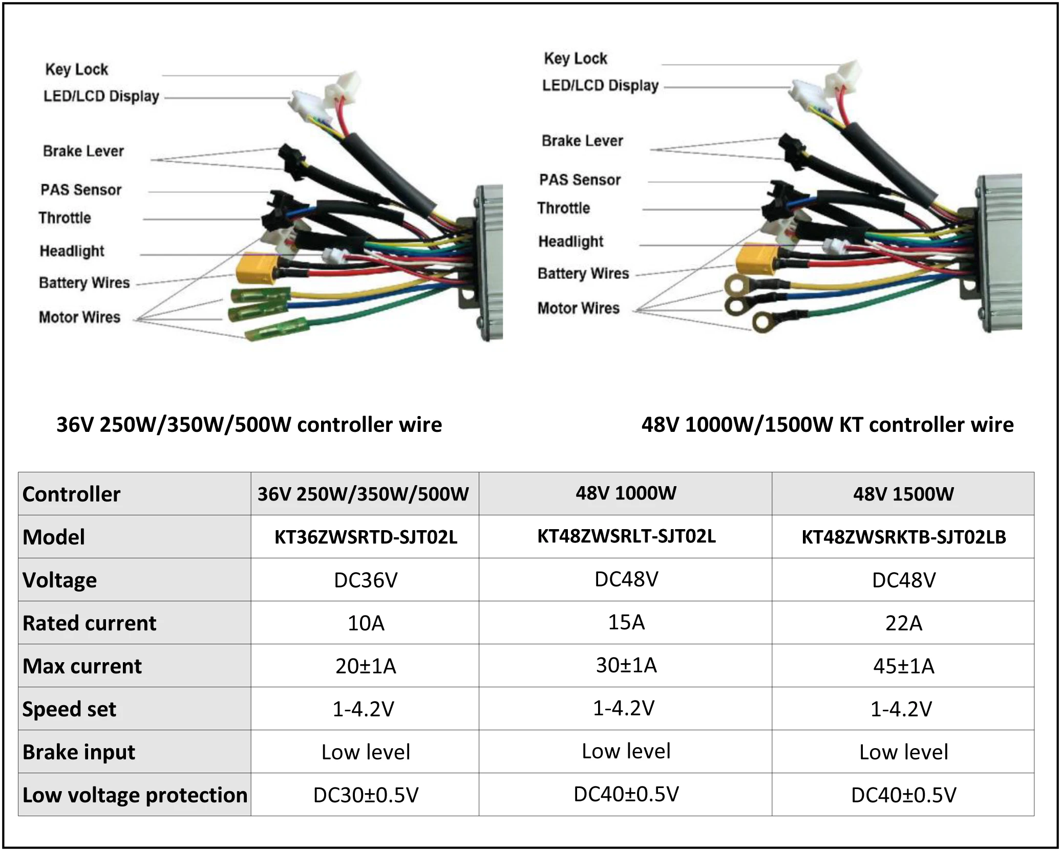 1. 36V 250W/ 350W/ 500W контроллер KT: Номинальный ток 10A, максимальный ток 20 ± 1A, размер 94x62x36mm