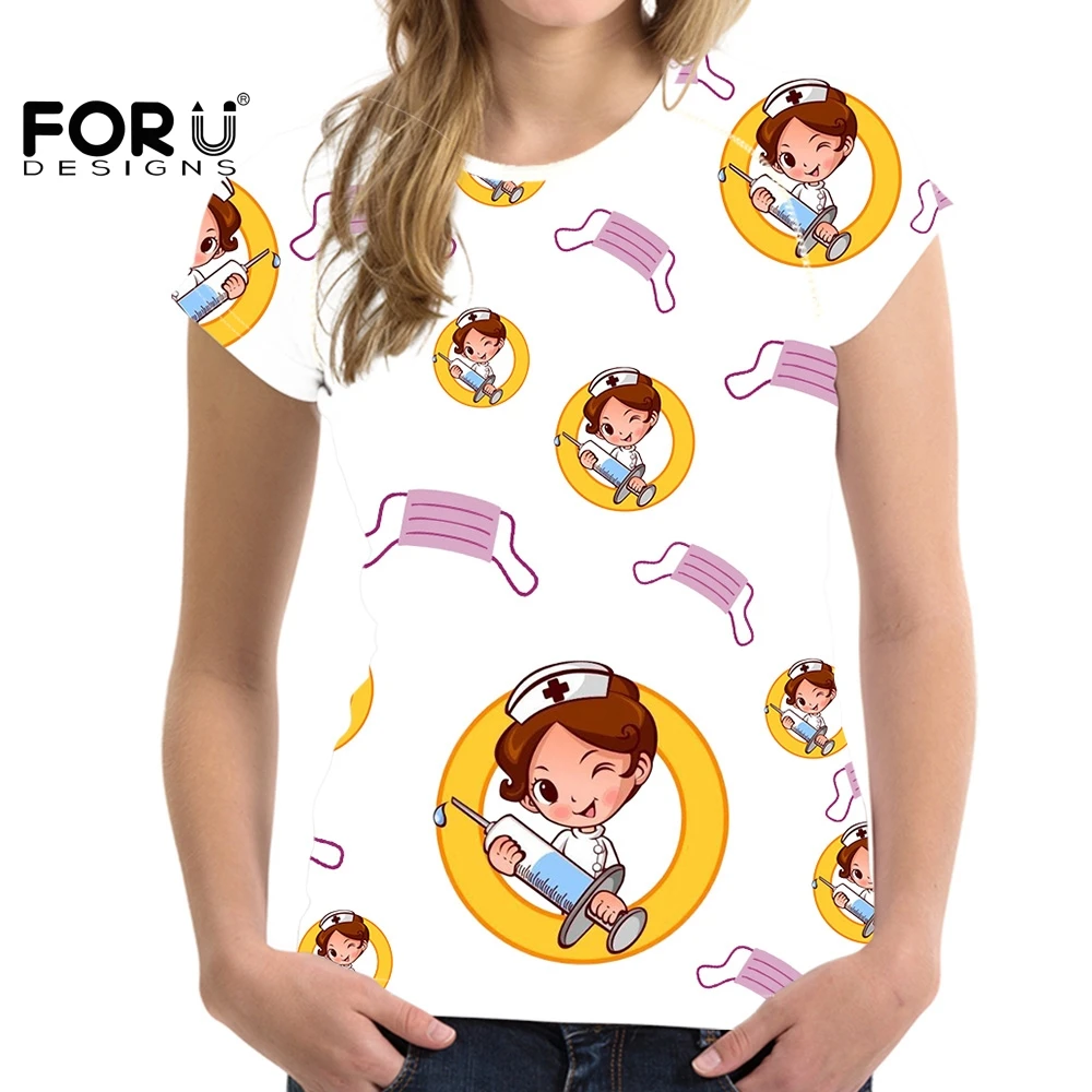 Лидер продаж, облегающие Женские футболки FORUDESIGNS, милая медсестринская маска, шприц, круг, мультяшный узор, женские топы, черная футболка, мягкая ткань для девочек
