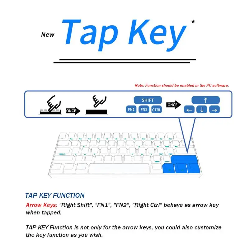 Функция крана:«Правый Shift», «FN1», «FN2», «Правый Ctrl» находятся в комбинации как клавиша TAP, вы можете установить функцию слоя tap, и при нажатии клавиши TAP, он включит эту функцию слоя. По умолчанию они ведут себя как клавиша со стрелками при нажатии.