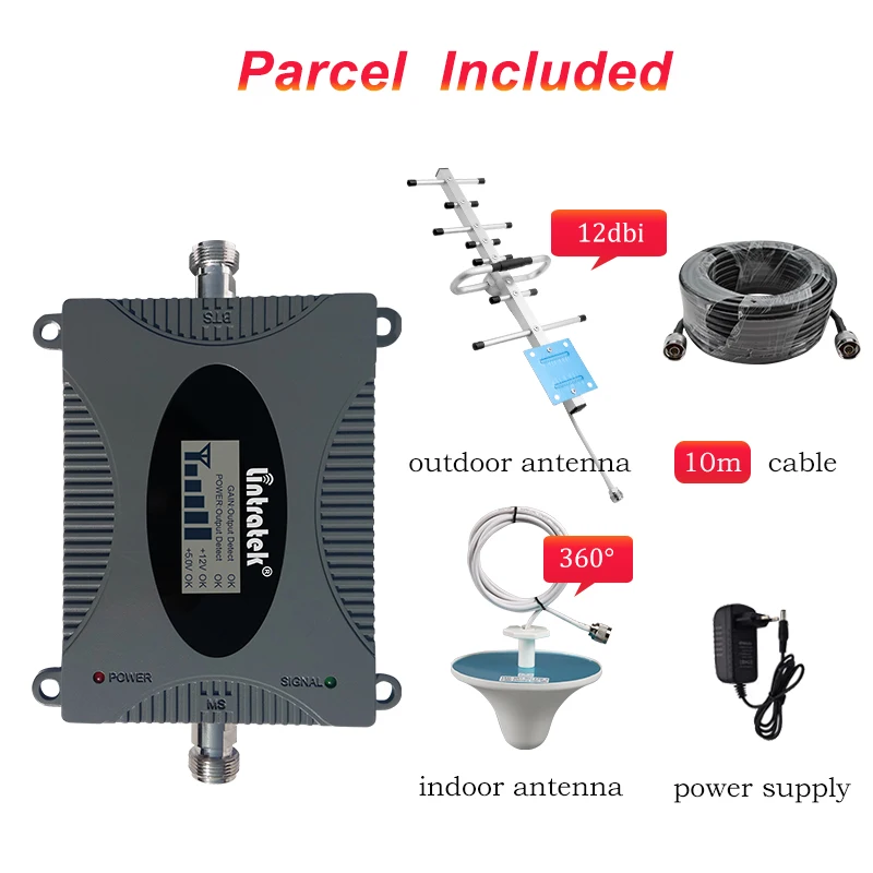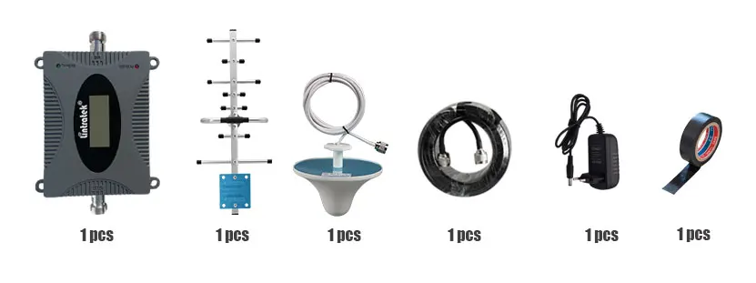 Lintratek Одноместный бустер × 1Внешняя антенна yagi 8 шт. × 1 (водонепроницаемая, 12dbi усиление)Внутренняя антенна × 1 (360 ° всенаправленная)Кабель 10 м × 1 (N папа)Блок питания × 1 шт. (5V 1A)Лента × 1 шт.