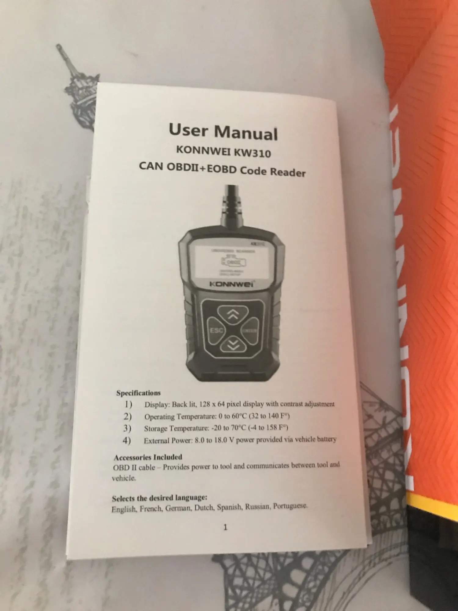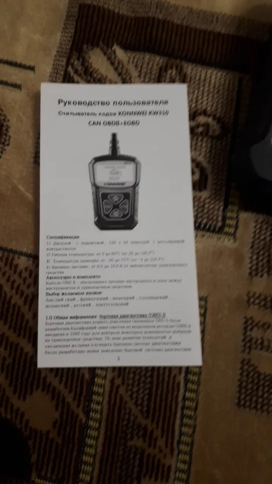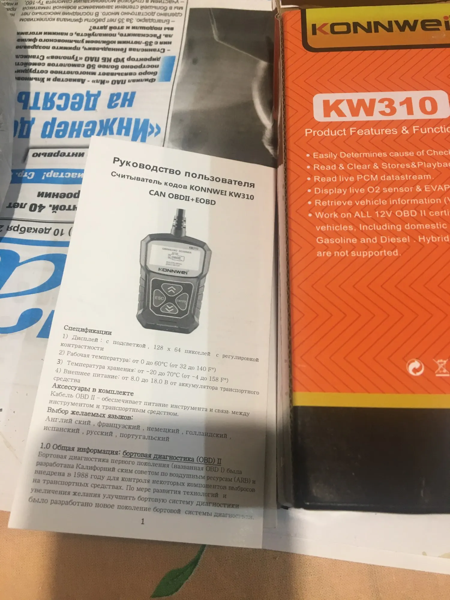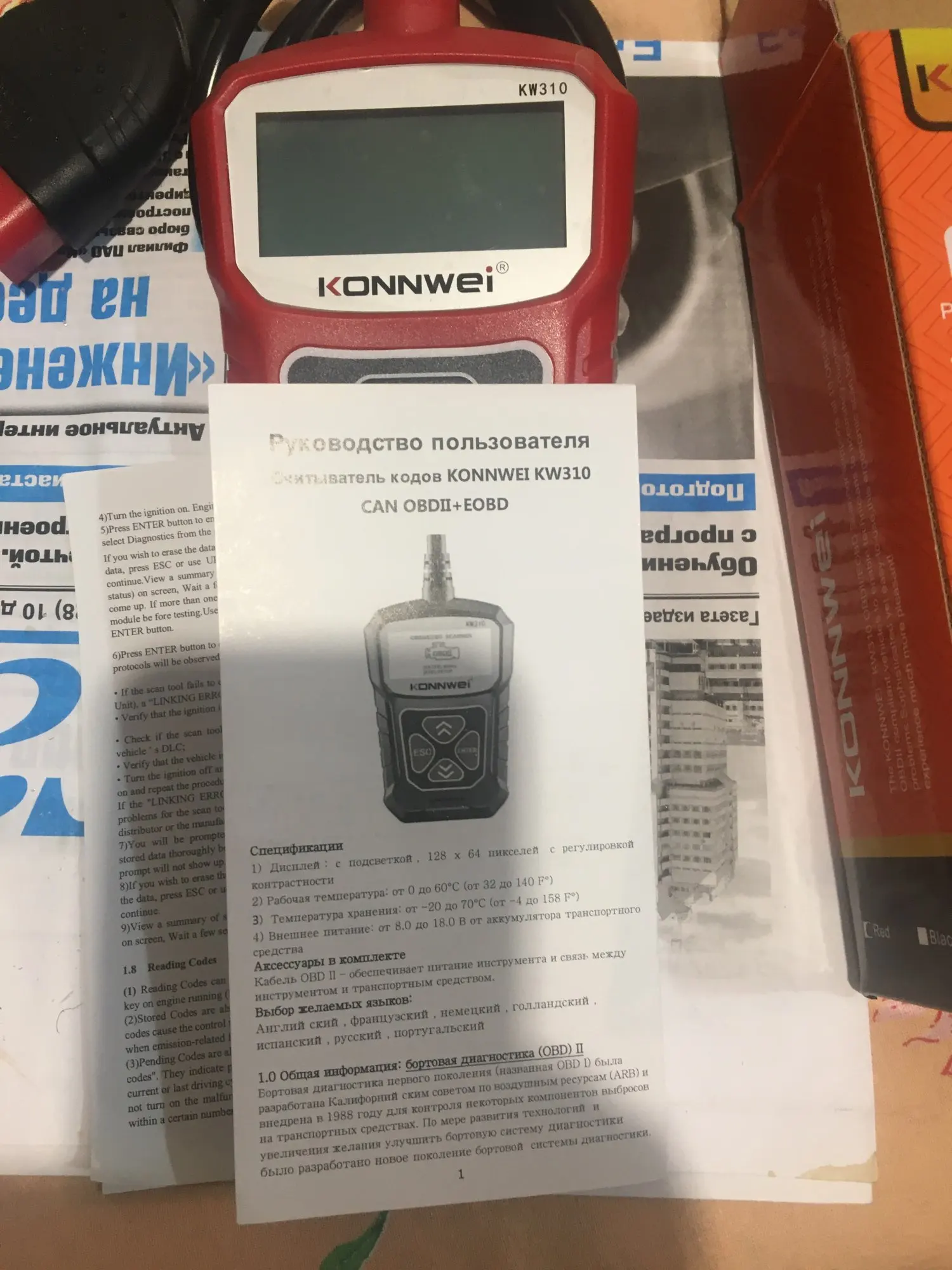 Описание товара очень точное. Дошел быстро и в целости, за исключением: упаковка сканера KW310 помята. Сам сканер цел. К нему есть инструкция и на русском языке. Сканер и тестер еще не проверял. Проверю - дополню отзыв. Рекомендую товар и продавца.
