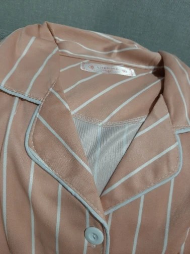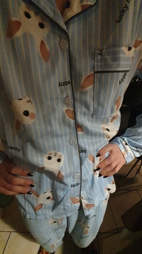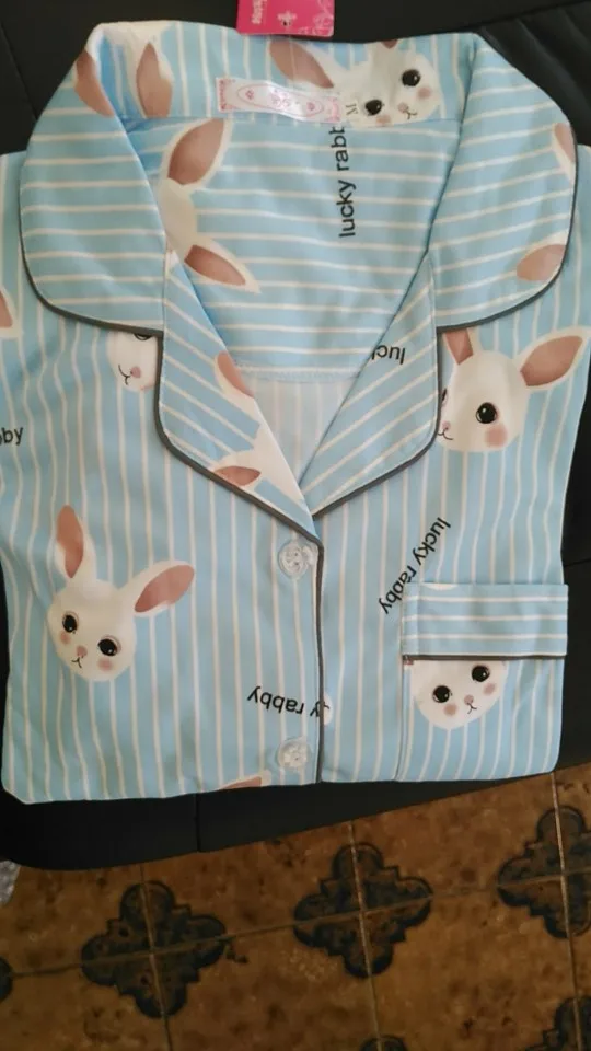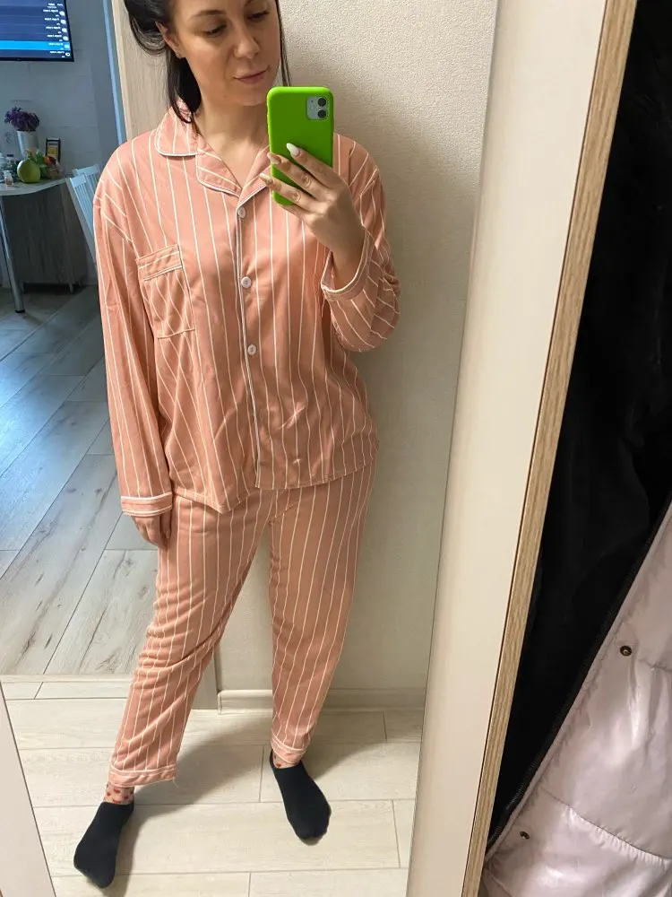 Пижамка пришла достаточно быстро, (8 дней до Волгограда) на фото пуговицы чёрного цвета, в жизни белые, но смотрятся даже лучше. Неровная строчка и торчащие нитки присутствуют. Штаны оказались не такие свободные как хотелось бы. Кофточка идеальная по размеру. И сшита аккуратней. Нитка торчит только на кармашке. Бирочка с размерами на кофте самоклеящаяся, и это большой +, так как легко снять и не останутся дырки от ниток. Ткань приятная, мягкая. С продавцом не общались.