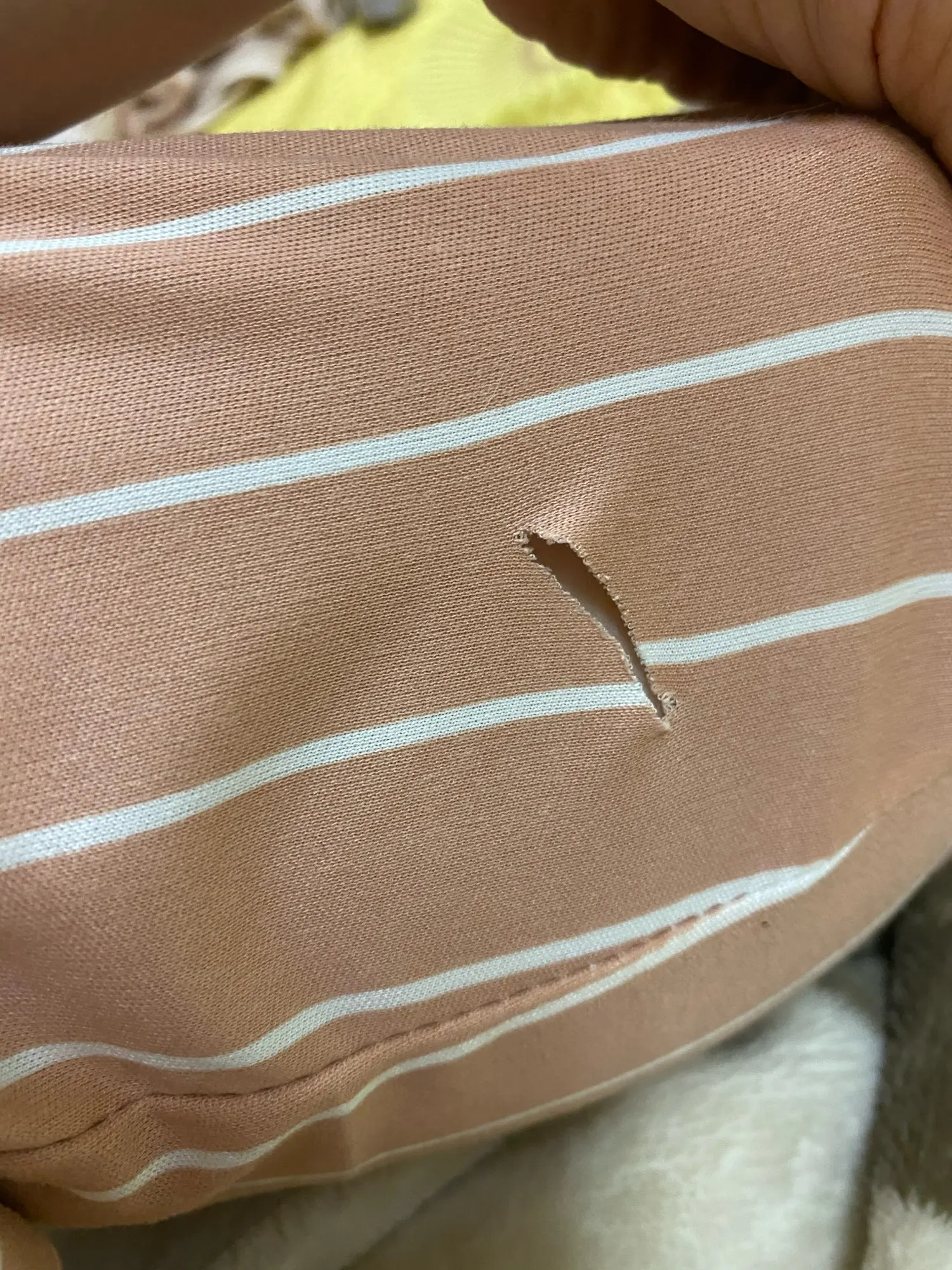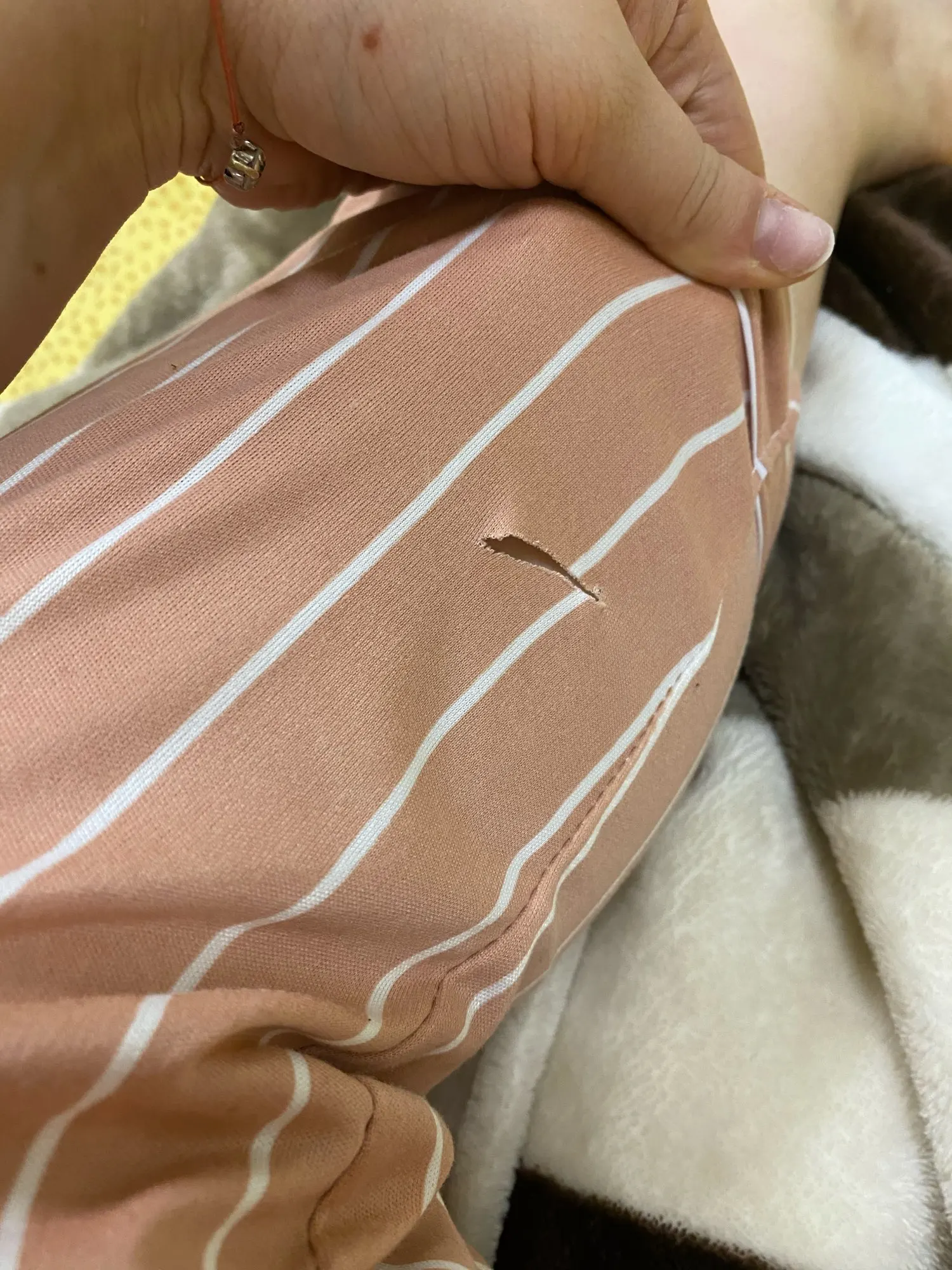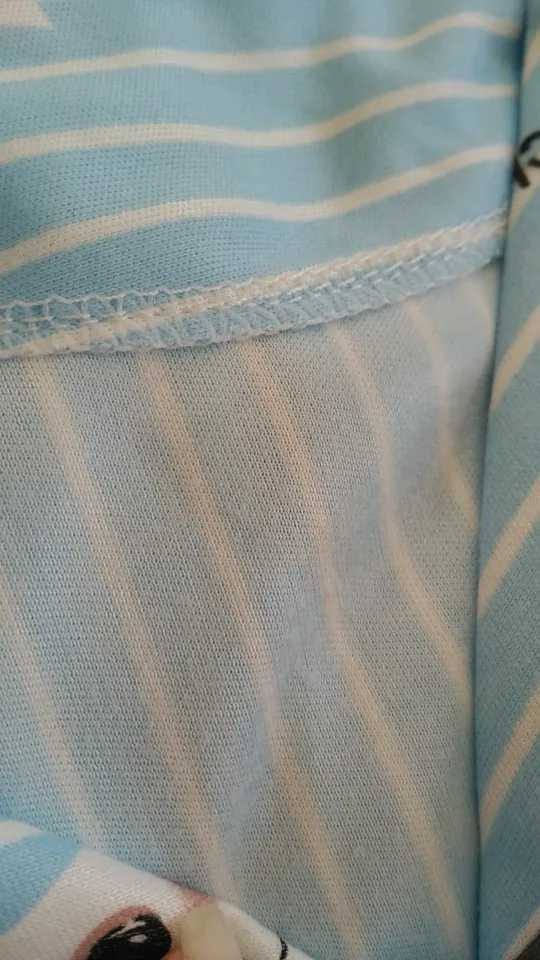 Заказ пришел очень быстро, пижама яркая, но верхняя часть на размер больше, и на ней есть небольшое пятно загрязнения и две крошечные дырочки в этом месте. не смертельно, но не очень приятно.