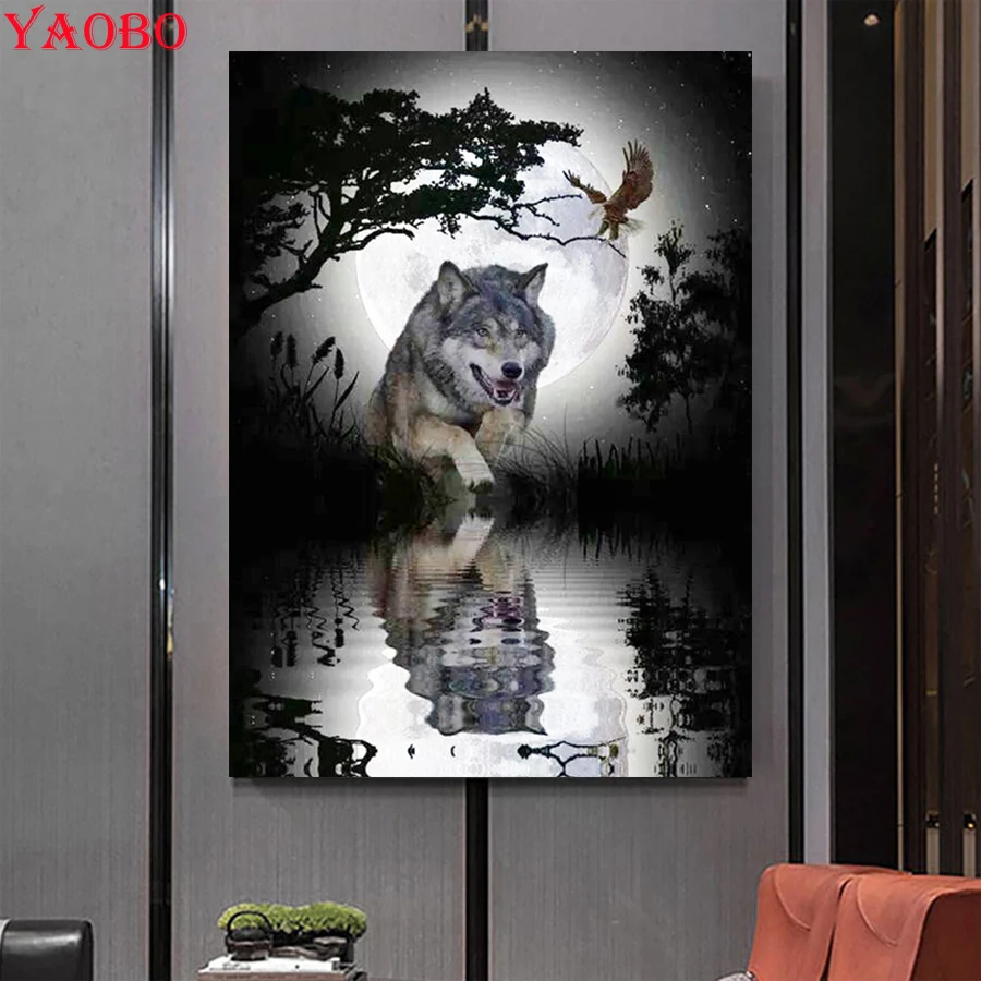 Волк отражение луна ночь пейзаж алмазная живопись вышивка крестиком 5d Сделай Сам полный квадратный круглый Алмазная вышивка Мозаика Декор Искусство