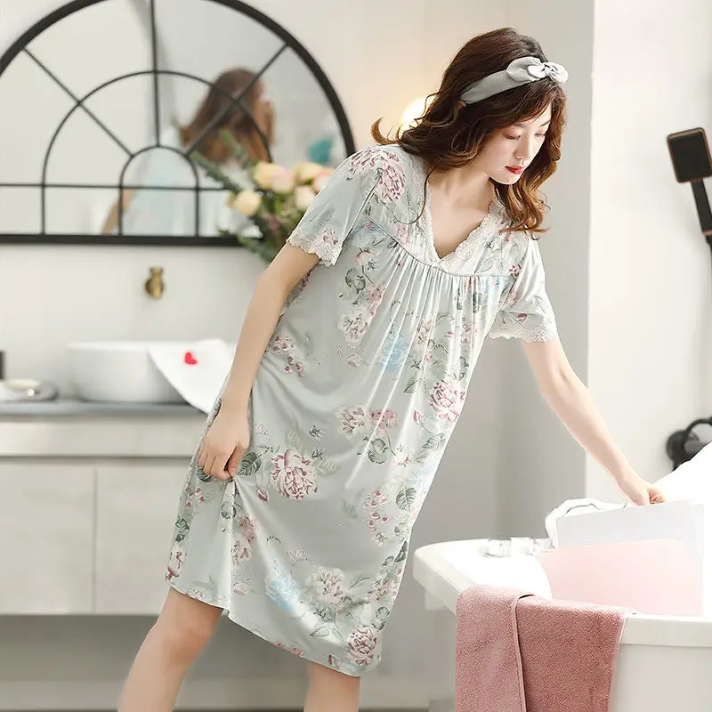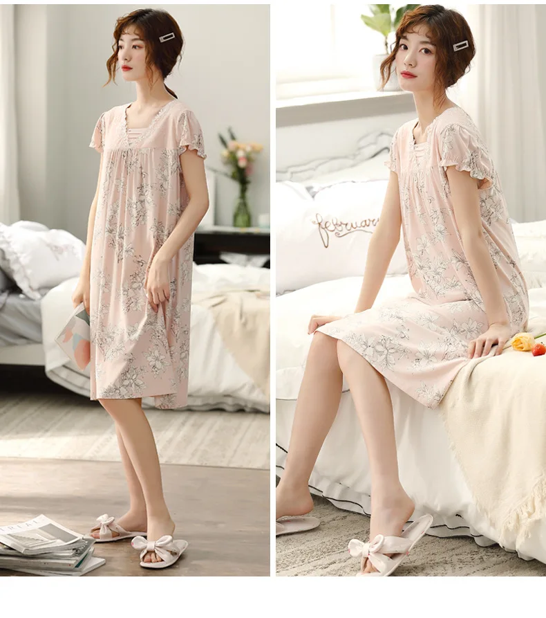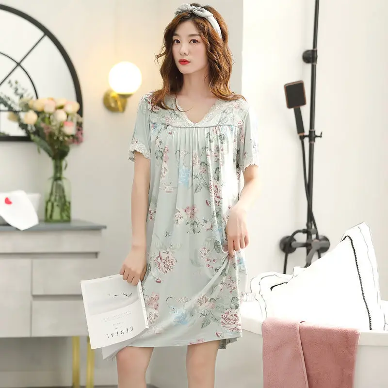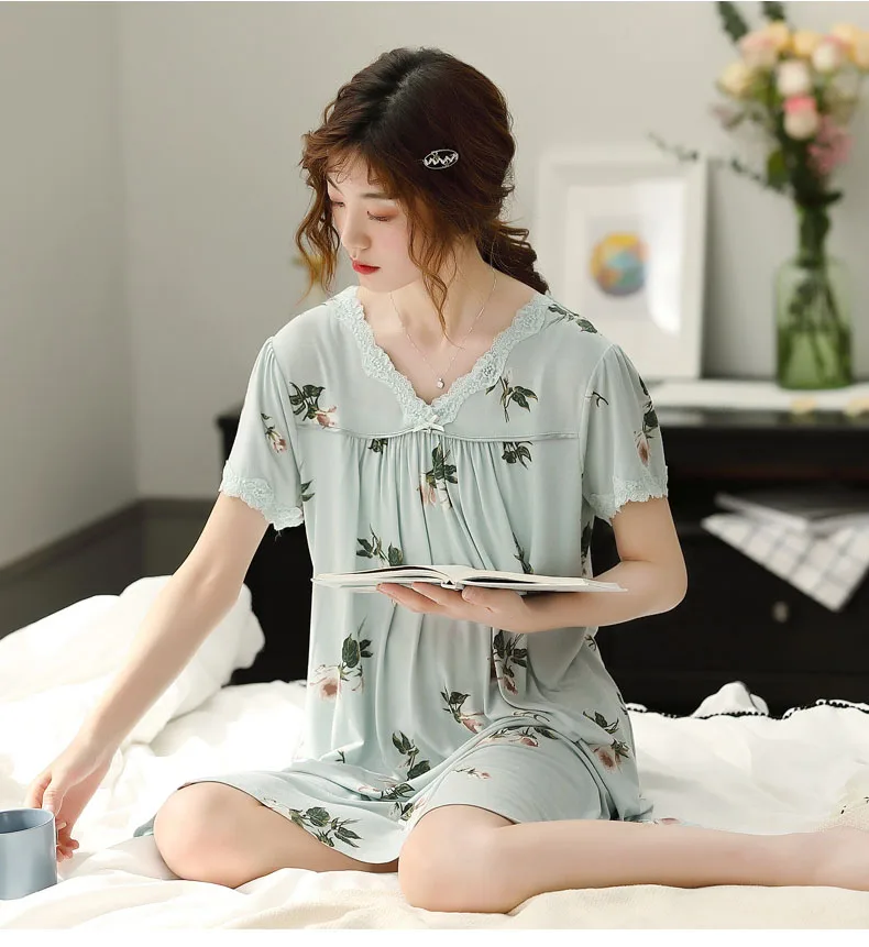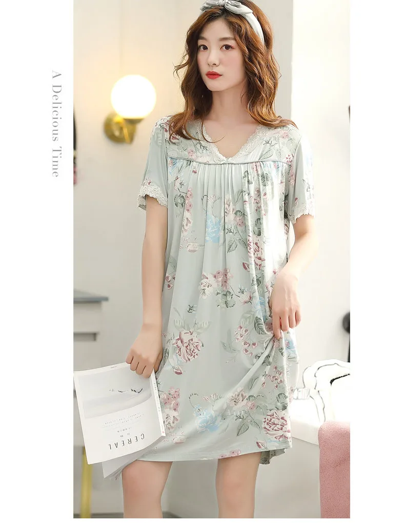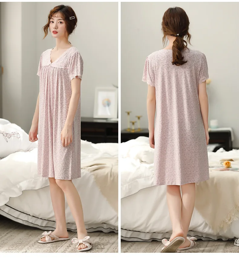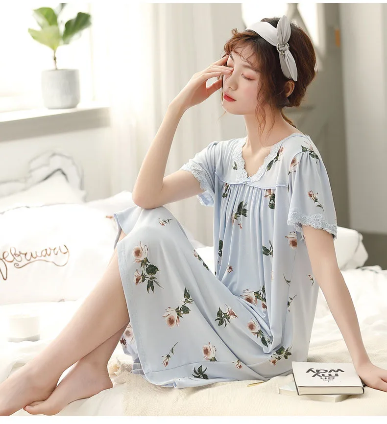 Новинка Женская Цветочная Пижама с коротким рукавом Пижама, пеньюар летняя ночная рубашка из модала и хлопка Повседневная Ночная Рубашка домашняя одежда