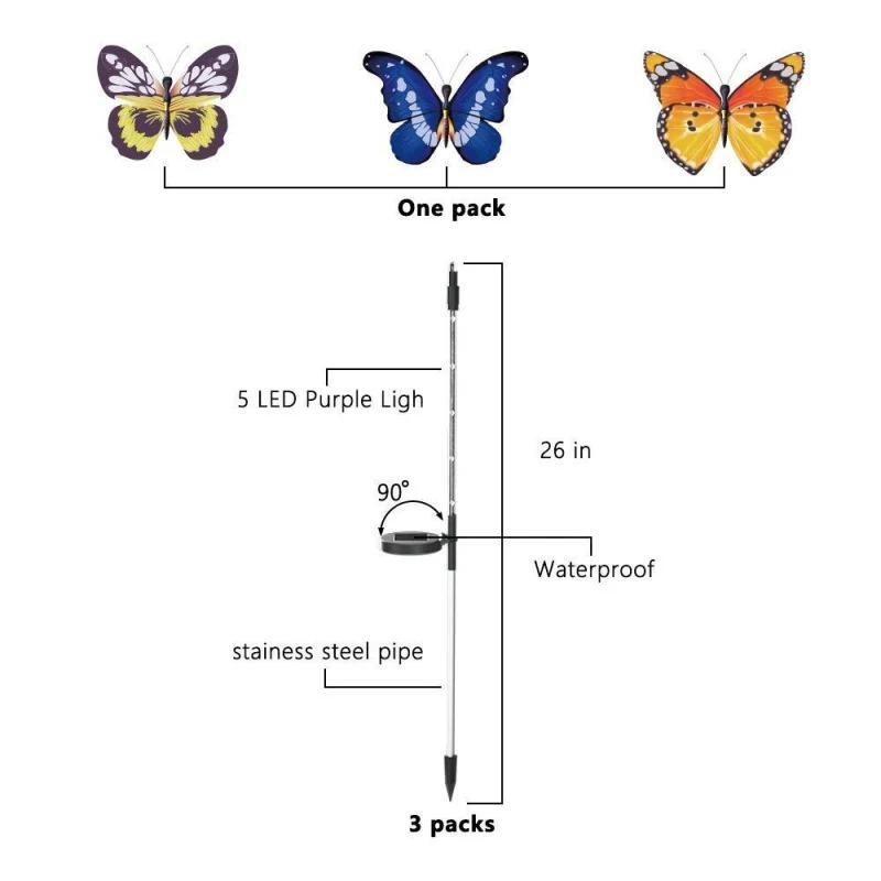 * Интеллектуальное управление питанием: эти красивые солнечные огни-бабочки, искусственные цветочные колышки, светятся на улице в саду. Оснащен перезаряжаемой батареей емкостью 600 мАч, которая работает около 6-8 часов в ночное время, если полностью заряжена в течение дня.