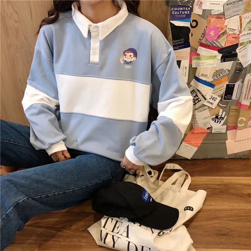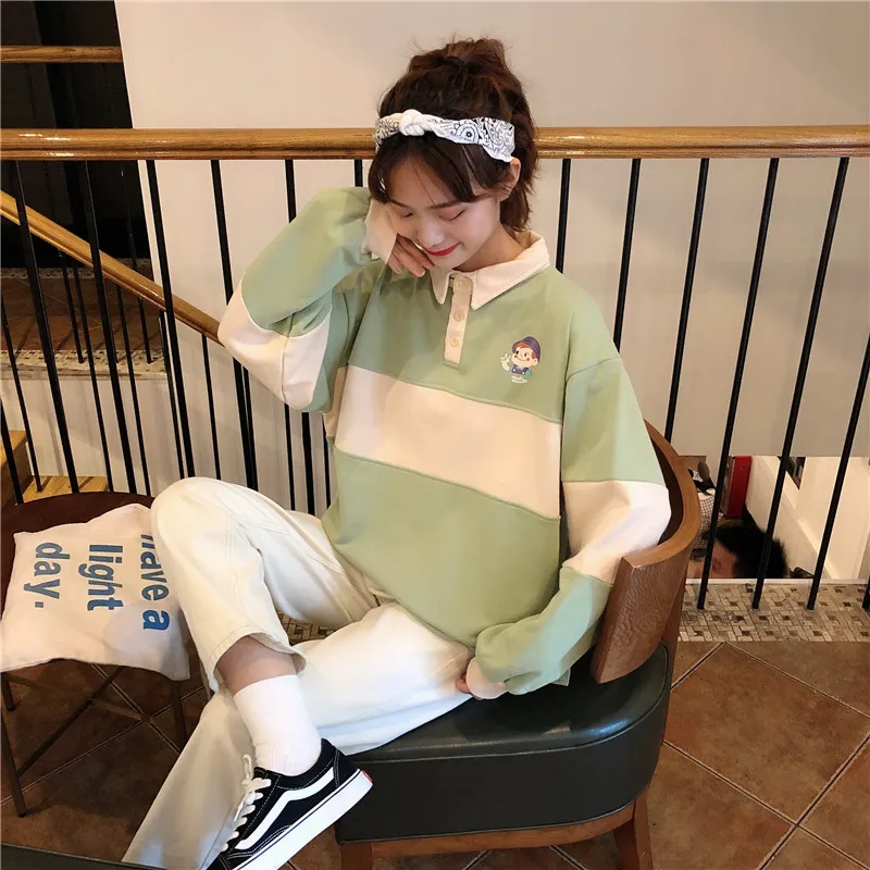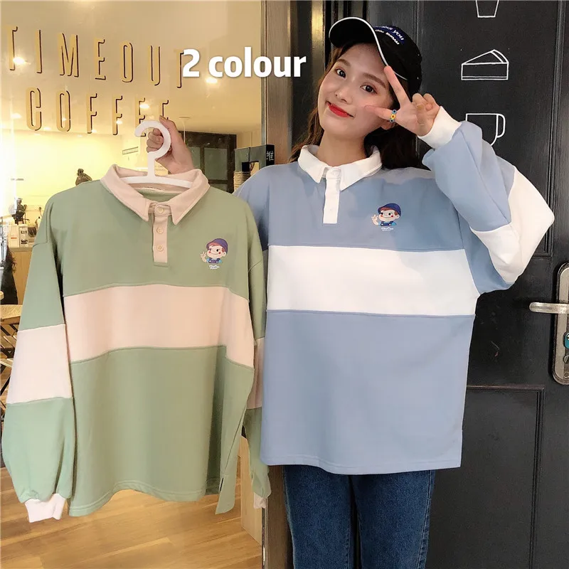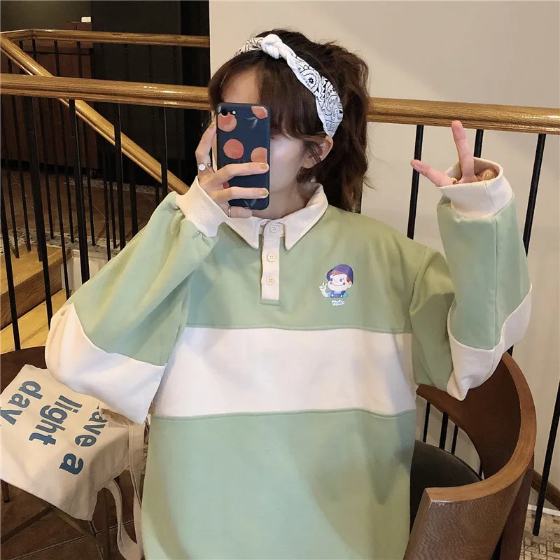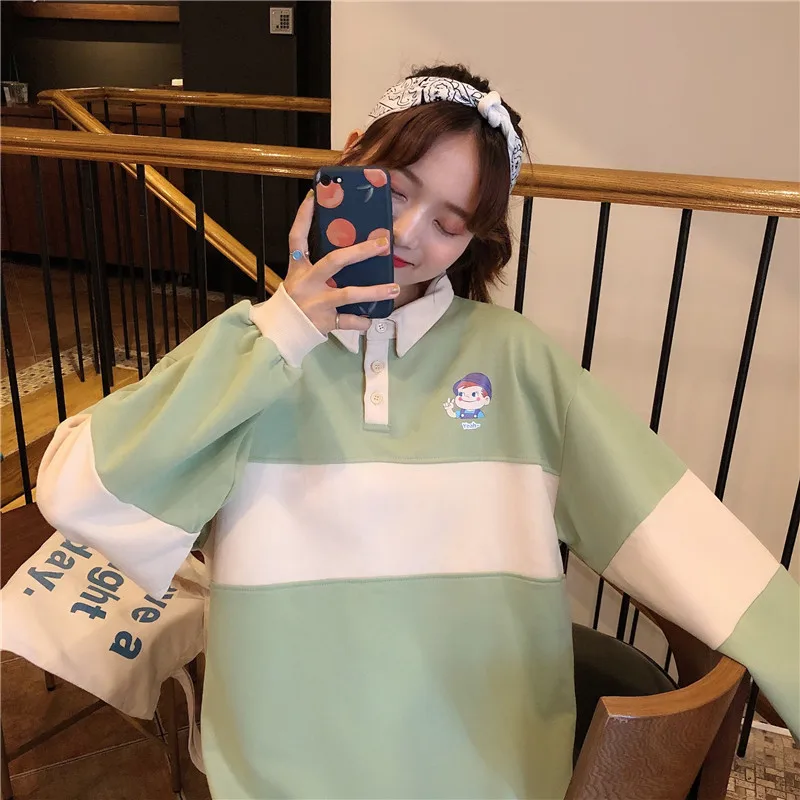 Новинка 2020, хит, Осенние повседневные женские толстовки, поло, воротник, пэчворк, свободного размера плюс, милые свободные пуловеры с длинным рукавом, женские топы
