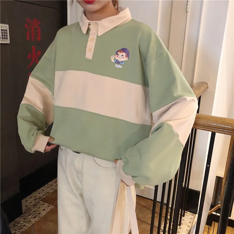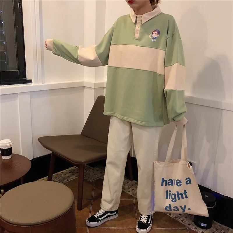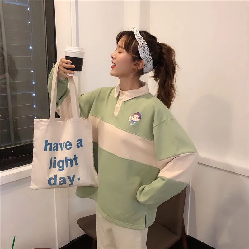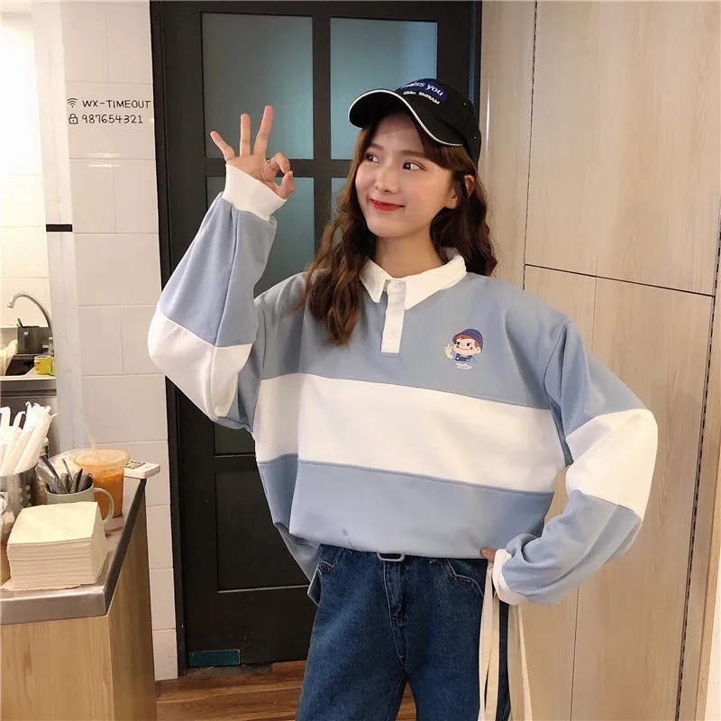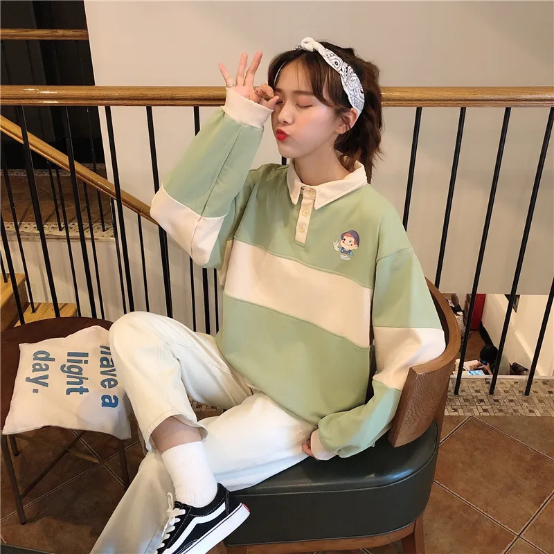 Новинка 2020, хит, Осенние повседневные женские толстовки, поло, воротник, пэчворк, свободного размера плюс, милые свободные пуловеры с длинным рукавом, женские топы