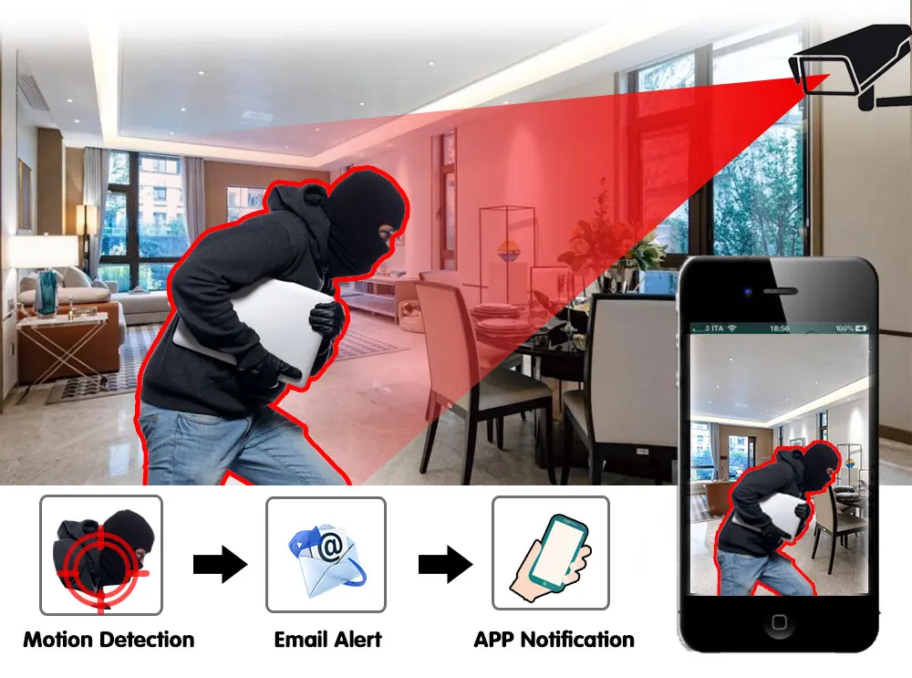 Когда вы находитесь на улице или дома, он отправит оповещения на ваш телефон, как только обнаружит какое-либо движение в области мониторинга, чтобы сохранить ваш дом в безопасности. Независимо от того, где вы находитесь, эта камера безопасности будет надежным защитником для вашего дома и позволит вам быть уверенным.