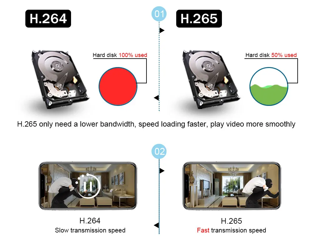 H.265 более четкий, HD разрешение предлагает вам лучшее качество изображения в более низкой скорости. Экономьте больше места для хранения, вы можете уменьшить размер файлов 40%-50%, сэкономить место для хранения HDD и снизить стоимость покупки.