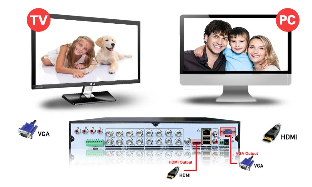 Просмотр на мониторе HDMl легко отображает видео через порт HDMI вашего монитора компьютера, чтобы в полной мере воспользоваться ясностью системы безопасности. (кабель HD не входит в комплект)Просмотр на телевизоре или мониторе ПК для дополнительного удобства, видеорегистратор также поставляется с подключениями VGA и BNC для стандартных вариантов просмотра разрешения.(Кабель VGA или BNC к RCA не входит в комплект.)