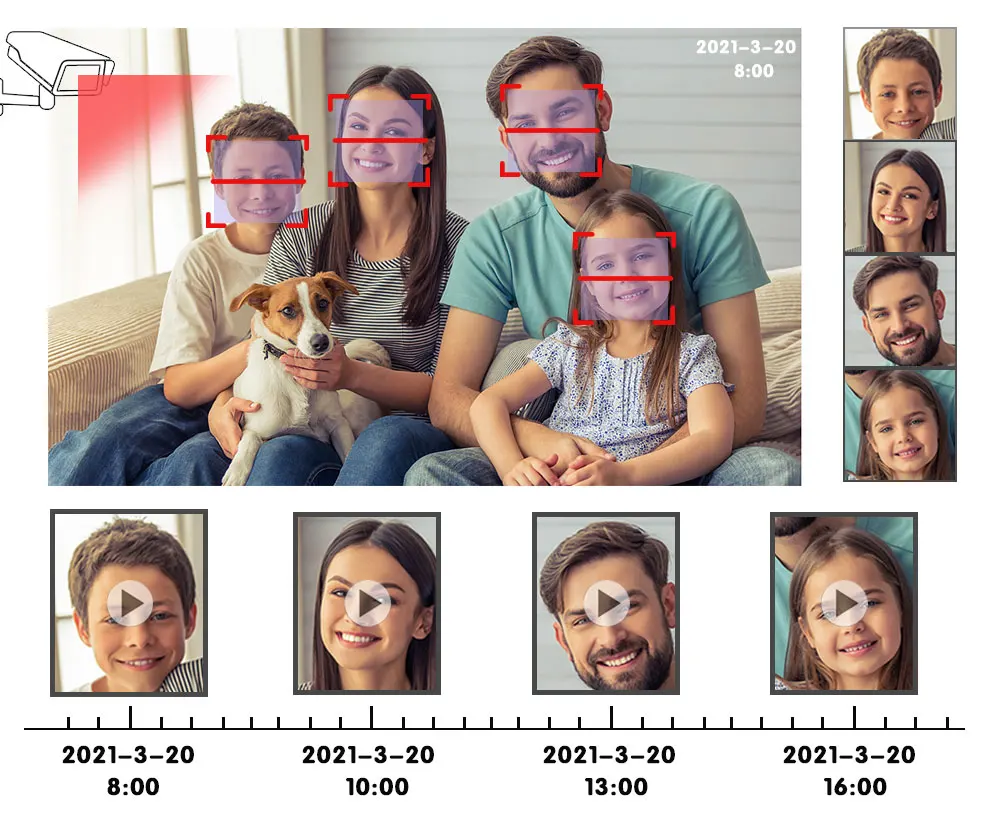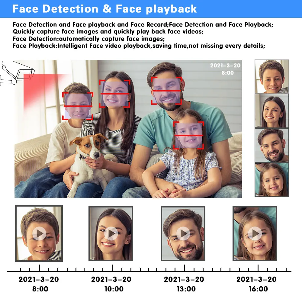 Распознавание лица, воспроизведение лица и запись лица; Обнаружение лица и воспроизведение лица; Быстрое снятие изображений лица и быстрое воспроизведение видео лица; Распознавание лица: автоматическое снятие изображений лица; Воспроизведение лица: интеллектуальное воспроизведение видео, экономит время, не упускает все детали.