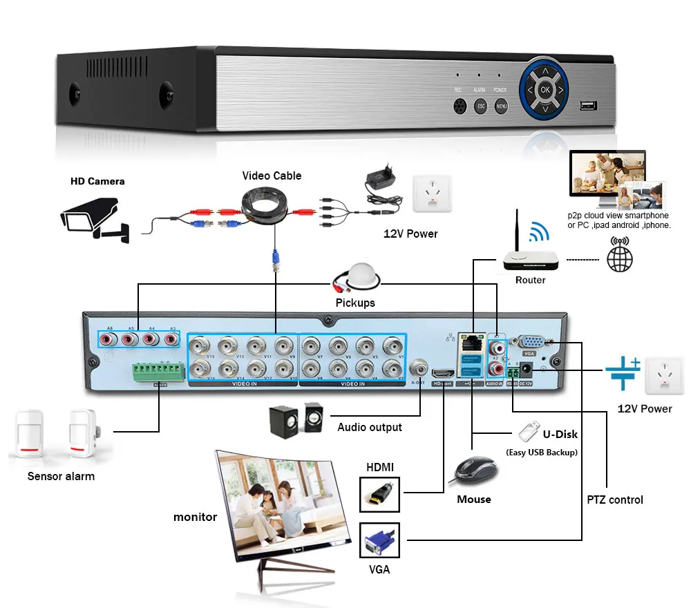 Простая настройка, всего 4 шага для просмотра мобильный телефон, просмотра видео в режиме реального времени из любого места и в любое время с помощью смартфона, стола или ПК с передовой технологией P2P, вы можете получить удаленный доступ к вашей системе за считанные минуты или меньше, нет необходимости в переадресации, удаленный доступ никогда не был таким простым!