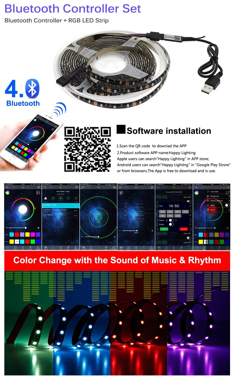 Bluetooth-управление музыкой, 5 В, USB-светодиодная лента, 2835 RGB, гибсветильник, 1 м, 2 м, 3 м, 5 м, черная светодиодная лента для фосветильник освещения телевизора.