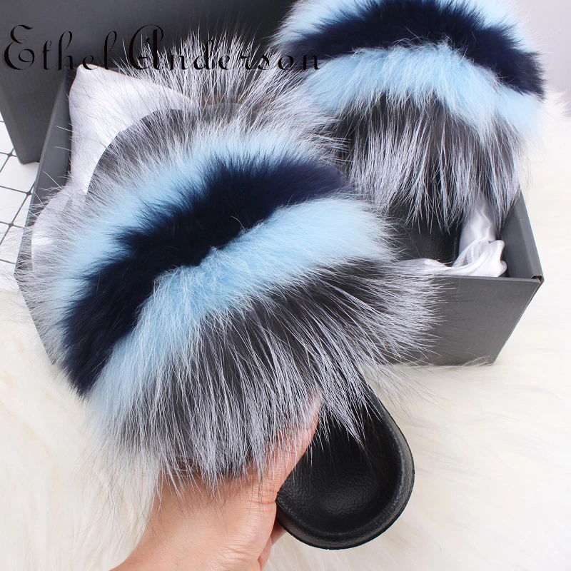 Шлепанцы женские из лисьего меха, 2021 г., модные, плюшевые, с ворсом