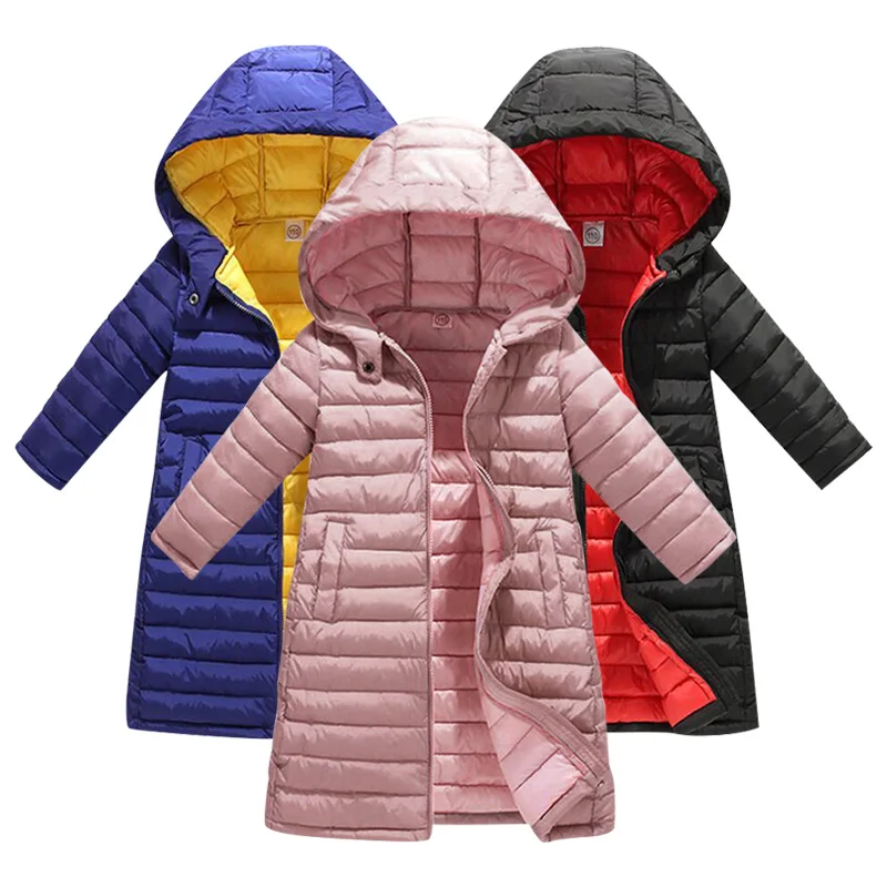 Лидер продаж, Зимние Детские утепленные пуховики на утином пуху для мальчиков и девочек длинная верхняя одежда с капюшоном и большим мехом детские плащи для девочек, пальто