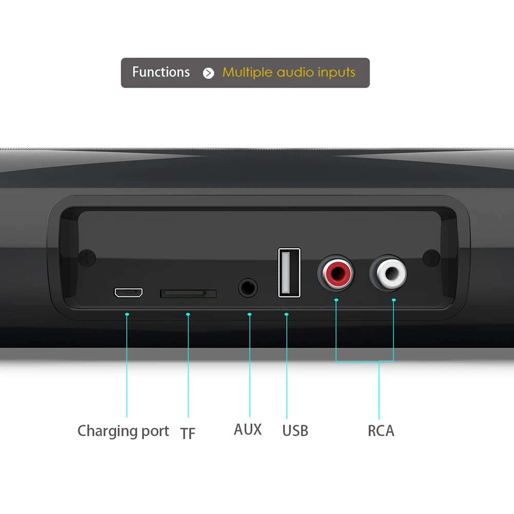 Канал: 2,0 1. Версия Bluetooth: V5.0 2. Динамик: 5 Вт * 4 3. Расстояние Bluetooth: 10 м 4. Батарея Емкость: 2000mA 3,7 V 5. Номинальное напряжение: 5 В постоянного тока 6. Время воспроизведения музыки: около 3 часов. 7. Время работы в режиме ожидания: 240 часов. 8. 1 а Время зарядки: около 2 часов. 9. Аудио вход: Bluetooth,RCA, 3,5 мм Aux, tf-карта , USB 10. Размер: 550x50x50 мм/ 21,65 дюймов x 1,97 дюймов x 1,97 дюймов 11. Вес нетто: 585 г 12. Fm-радио частота: 87,5-108 13. Аксессуары: зарядный кабель, 3,5 мм-RCA кабель, дистанционный пульт, Руководство по эксплуатации 14. Поддержка Телевизор/ПК/телефон/планшет/ноутбук/MP3/M P4/dvd-плеер/ТВ-приставка аудио