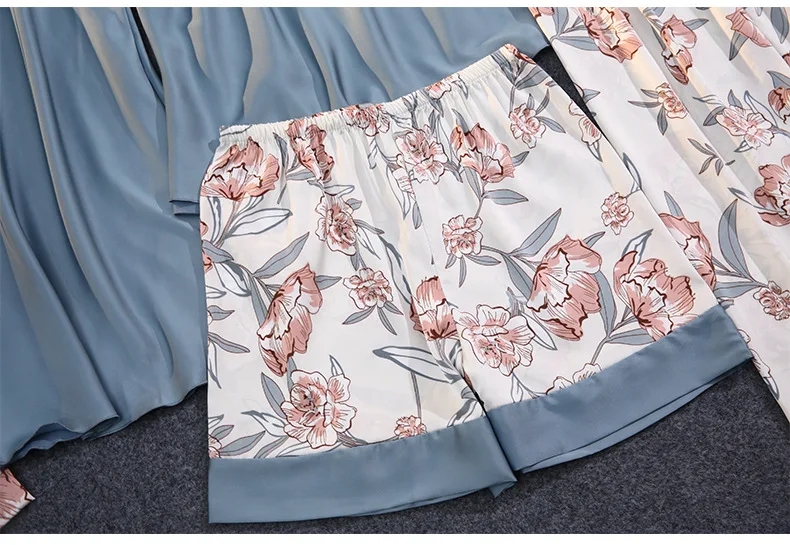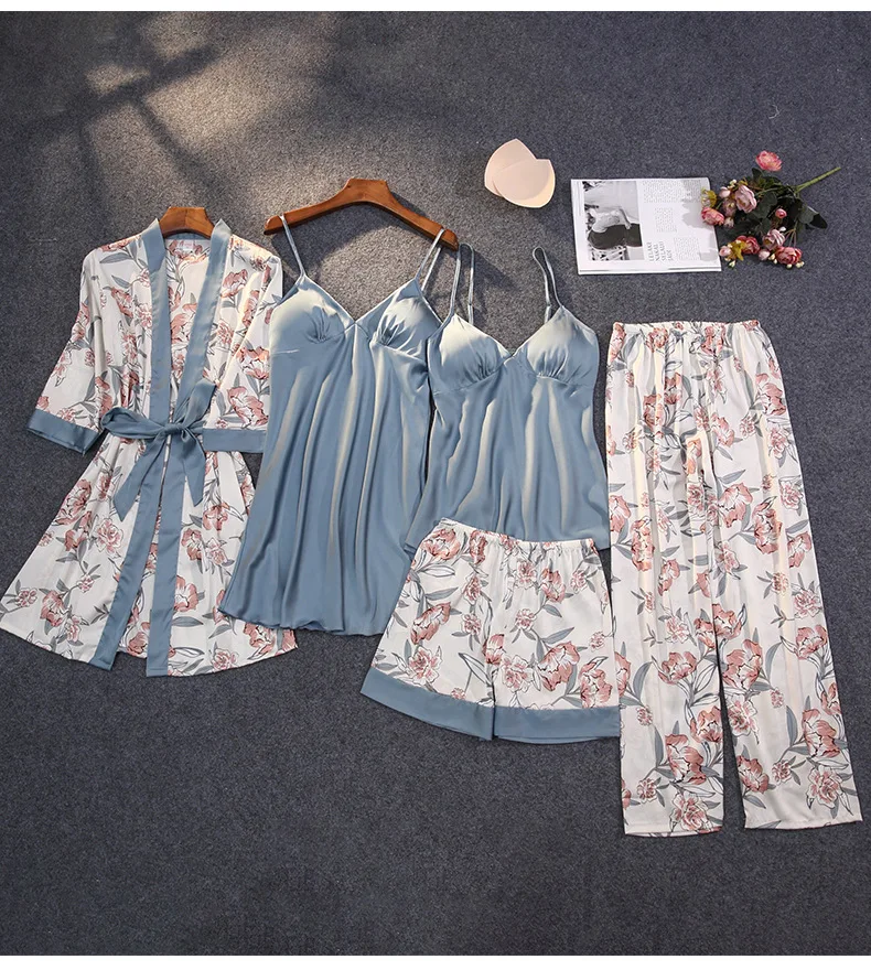 Пижамный комплект с принтом, шелковая Женская одежда для сна из 5 п...