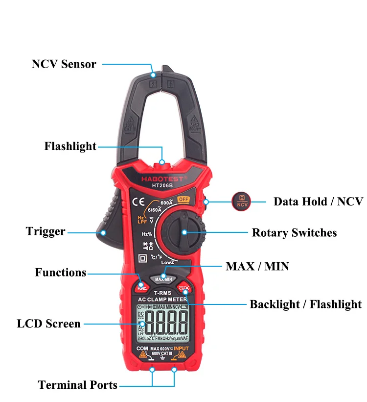 Цифровой зажим HABOTEST HT206D переменногопостоянного тока для измерения напряжения переменногопостоянного тока, переменногопостоянного тока, Бесконтактный мультиметр