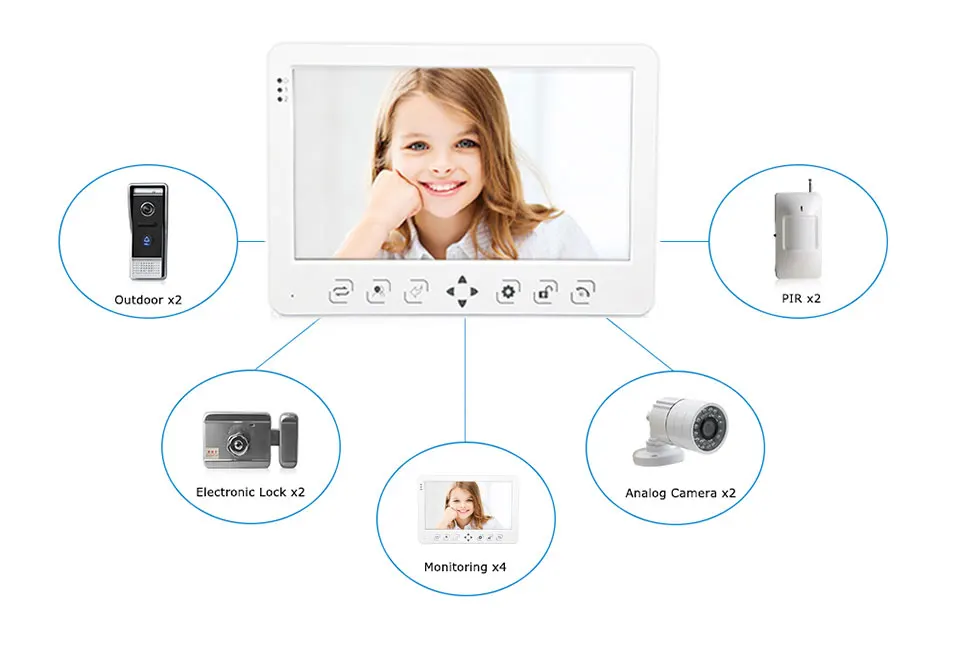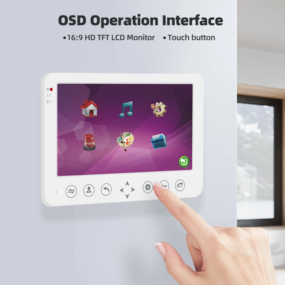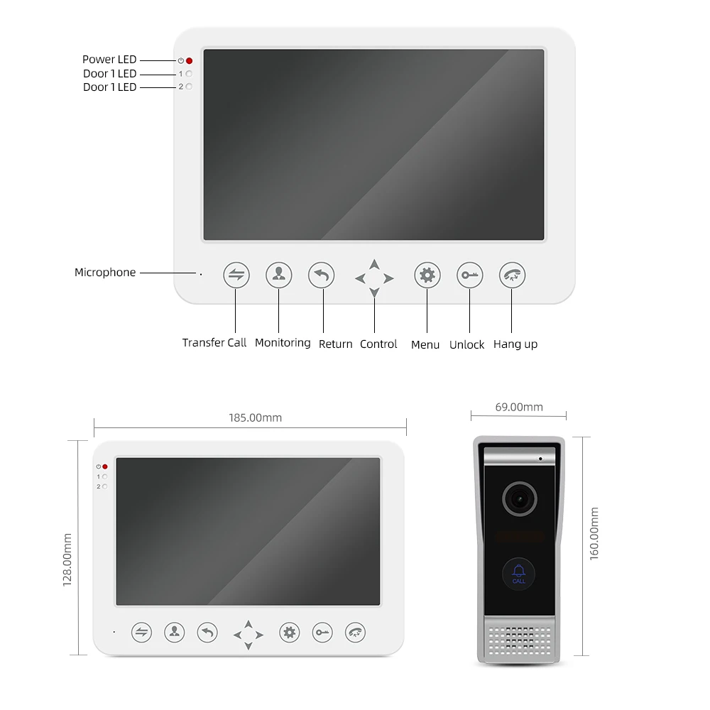 ♦960P HD пикселей ♦Супер тонкий дизайн ♦Сенсорная кнопка ♦Интерком от комнаты до комнаты ♦Ответ на дверь, мониторинг и разблокировка ♦Регулируемый цвет, яркость и громкость ♦Встроенная память может сохранять 86 фотографий, поддержка внешней карты памяти Макс. 32 Гб SD ♦12 мелодий на выбор
